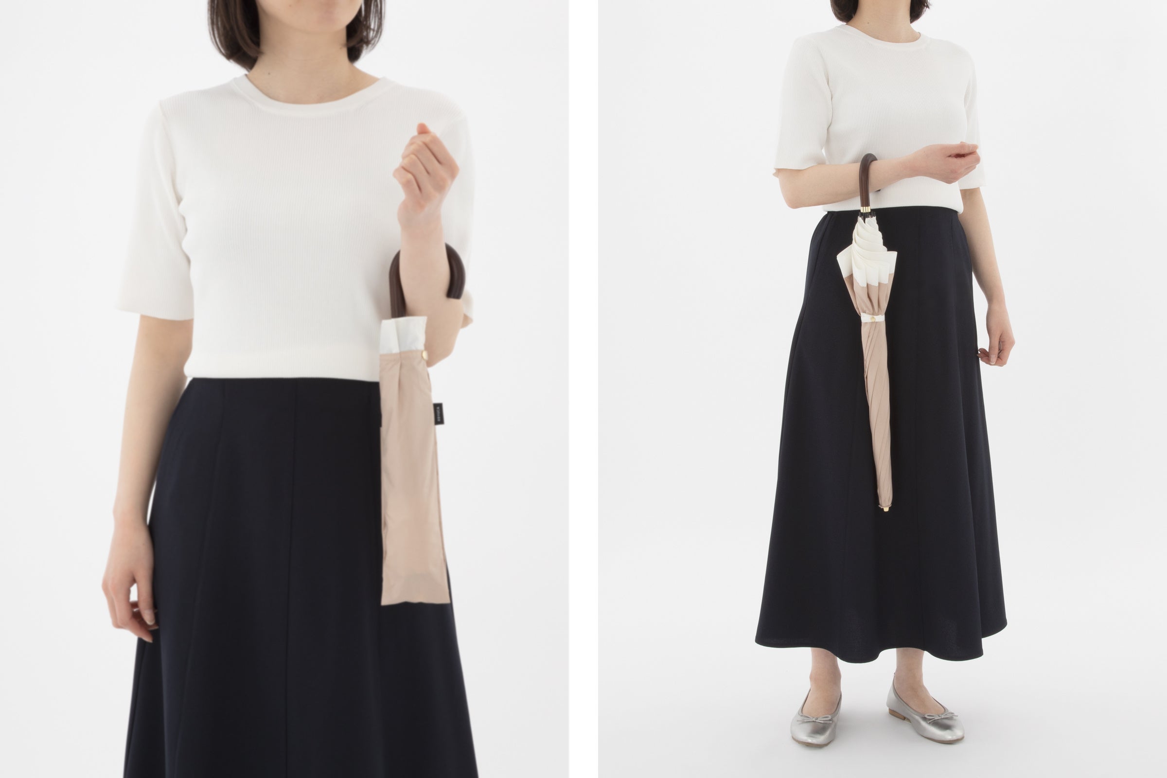 コロナ禍で長傘の需要が増えたことから、折畳傘の携帯性と長傘の利便性を掛け合わせたものが本商品です。持ち運びしやすいサイズで、畳む手間を軽減するために、長傘の状態でも仮止めできる2段折の折畳傘です。長いままでも仮止めできる胴ネームを取り付けたことで、長いまま持ち歩くこともできる仕様にしました。さらに、付属の袋は傘を伸ばした長傘の状態でも入れることが可能なので、濡れた傘によって服を濡らす心配を軽減します。 3段折のタイプと比較すると、折り目が少ない構造のため、簡単にきれいに畳むことができます。手元は木製の曲がり手元を使用、腕にかけて持ち運ぶこともできます。雨天時だけではなく、UV加工を施しているため日傘としても使用することができます。