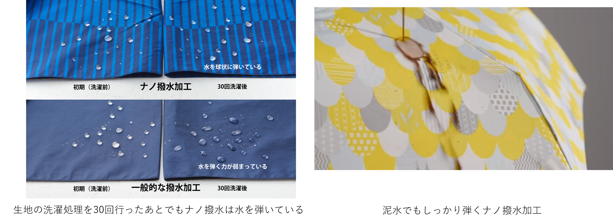 昨年販売を開始した折畳傘の人気柄が長傘でも登場しました。通常の撥水加工よりも高い撥水効果と耐久性のあるナノ撥水加工を施し、傘を持ち運ぶときのストレスを軽減してくれる1本となっています。生地に水滴が残りづらいため、傘を閉じて持ち運ぶ際、荷物や服が濡れてしまう心配を軽減します。また、防汚性・撥油性に優れており、手元には抗菌加工を施している樹脂を使用しているため、清潔に保つことができます。 UVカット加工を施しているので、日傘としても使用できます。