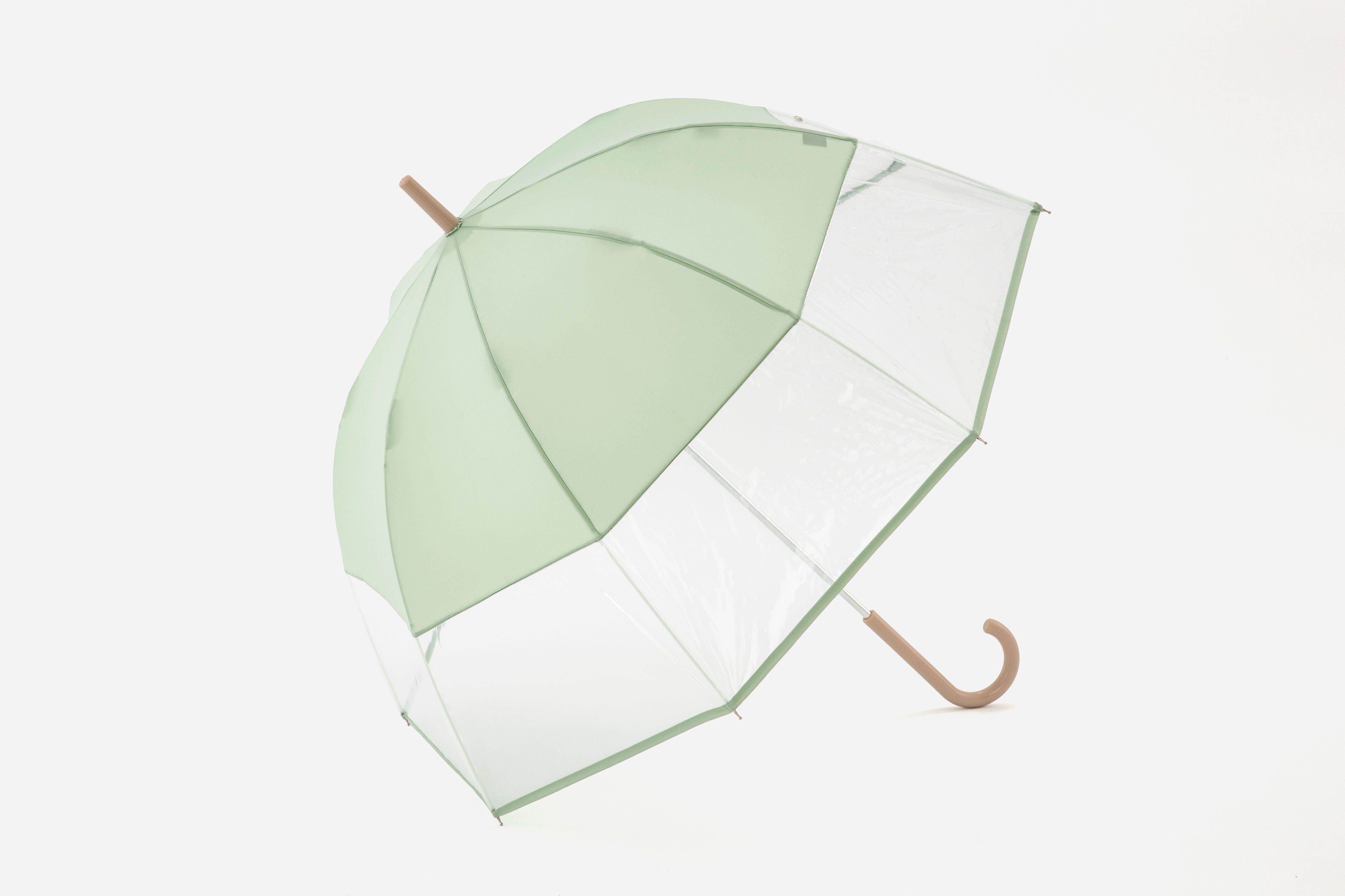 昨年発売からわずか1年で13,000本以上を売り上げたヒット商品に春の新色ライトグリーンが登場。撥水生地×ビニールの組み合わせで軽やかな印象の長傘です。撥水生地を使用した傘の撥水力と、ビニール傘の透明で前が見えやすいメリットを掛け合わせたハイブリッド傘です。縁にビニールを使用しているため、傘を深くさしても前が見えやすく、安全性も考慮したデザインが特徴です。親骨の長さは安心の65cmと大きめサイズ。一般的な傘よりも深いドーム型になる形状で、肩まですっぽりと覆ってくれます。手元には抗菌加工を施した樹脂を使用しています。