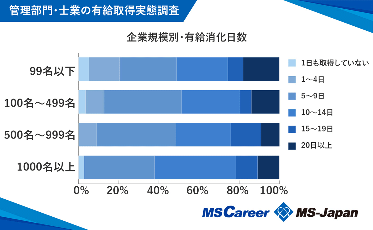 また企業規模別でみると、企業規模が大きくなるほど有給取得日数が5日を下回る人の割合は減り、有給を10日以上とれている人の割合は、企業規模が1000名以下の場合5割前後だったのに対し、1000名以上では6割を超え、差が出る結果となりました。