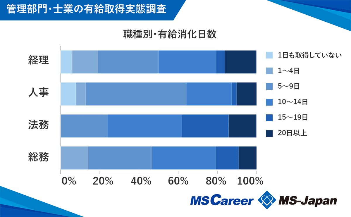 さらに、職種別では、「20日以上」取得の割合が最も高いのは経理の16.2%である一方、今回の調査では、法務は、有給取得日数が5日を下回る人が0%でした。