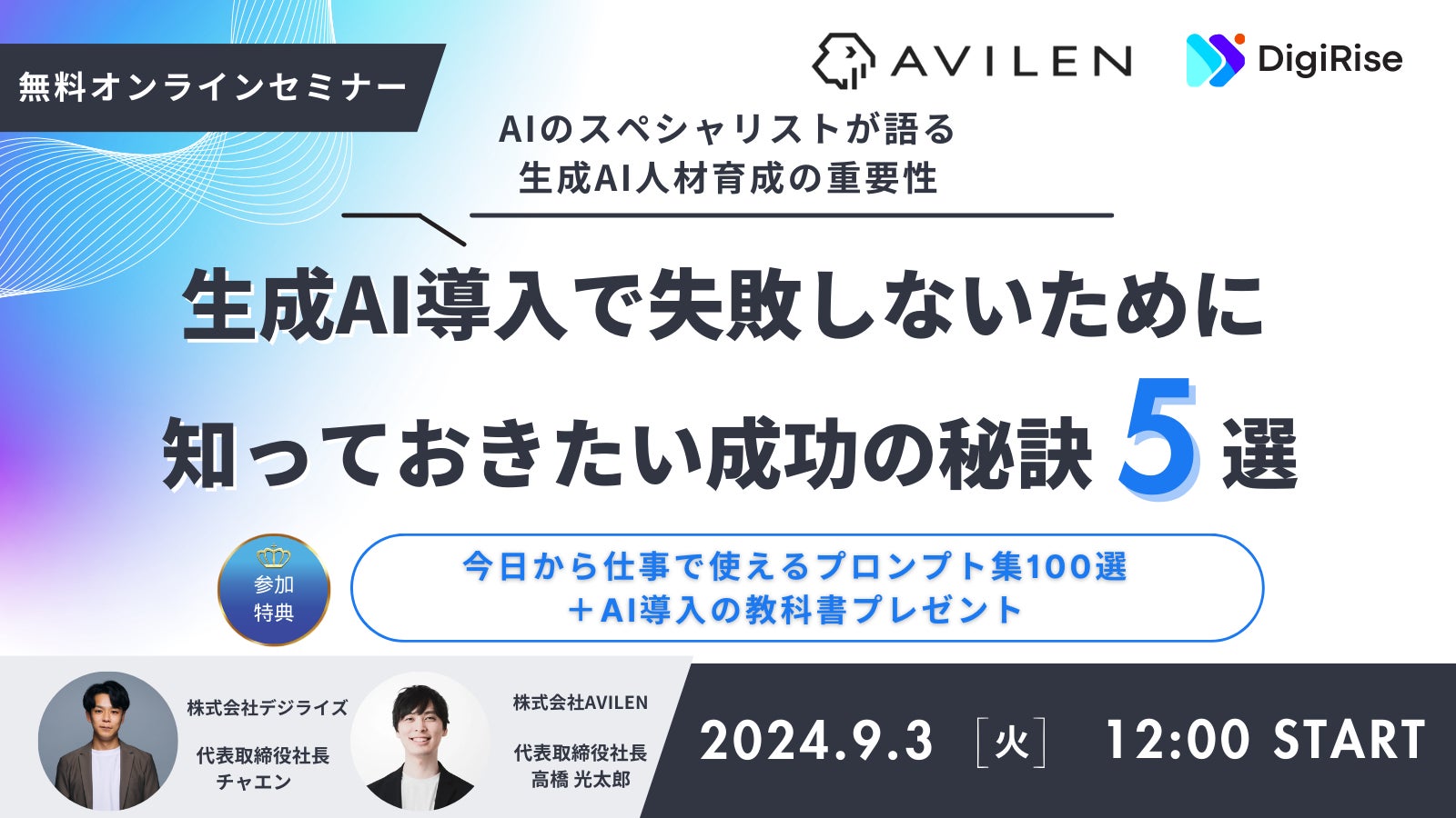 株式会社AVILEN(本社:東京都中央区、代表取締役:高橋 光太郎、以下「AVILEN」)は、株式会社デジライズ(本社:東京都渋谷区、代表取締役:茶圓 将裕)との共催ウェビナー『生成AI導入で失敗しないために知っておきたい成功の秘訣5選』を開催いたします。