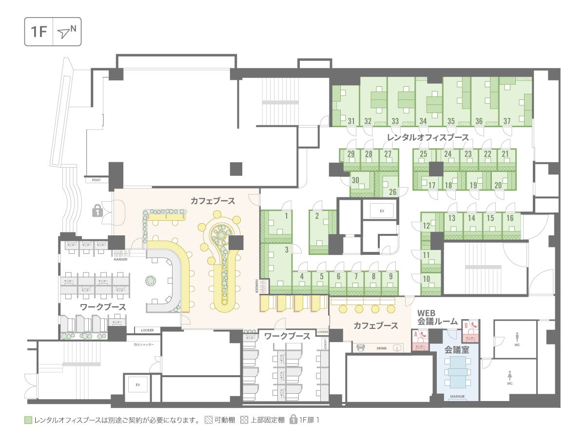 設備 :Wi-Fi、フリードリンク、無料プリンター、ロッカー、ポスト、登記可、会議室、WEB会議用個室