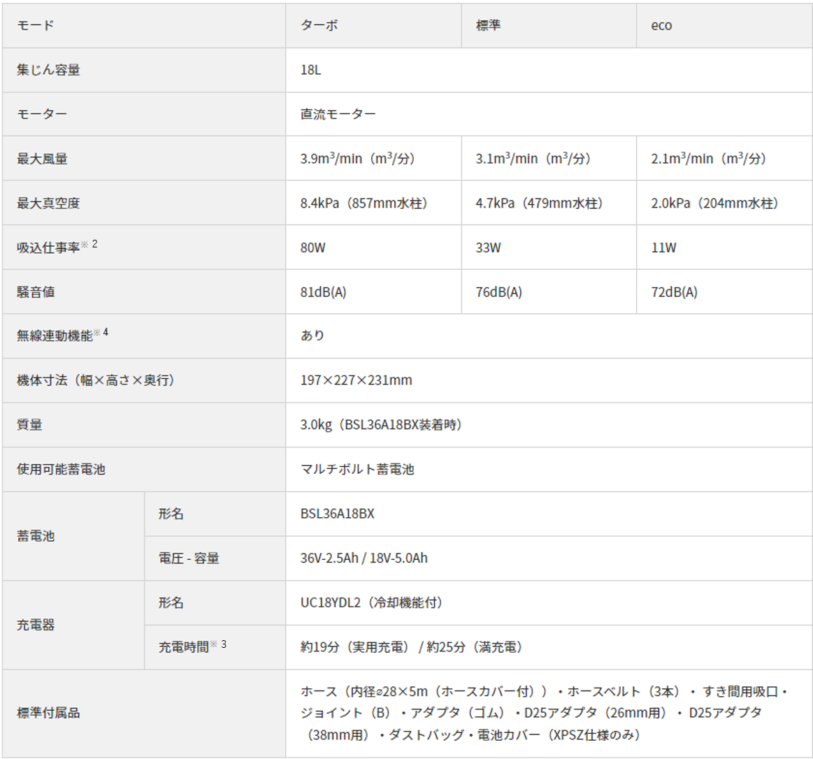 ecoモードで52分、標準モードで25分、ターボモードで12分の連続作業が可能です。