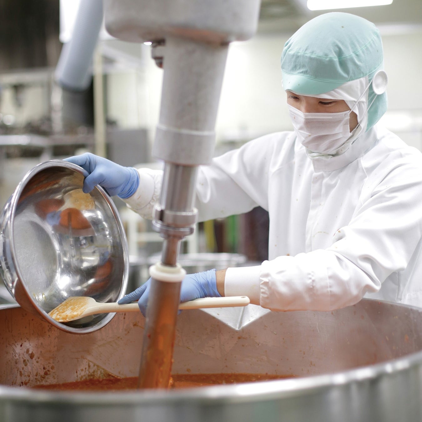 全国に商品を送り出すようになった今でも、レストランの厨房でつくるように、手づくりの工程を多く残しながら、工場で働くひとりひとりが丁寧に心を込めてつくっています。巨大なタンクで一度につくる大量生産では、再現しきれない「おいしさ」を守るために『少しずつをたくさん』という製法を大切にしています。創業の味がぶれないよう、効率よりも おいしさに重きをおいたつくり方を続けています。