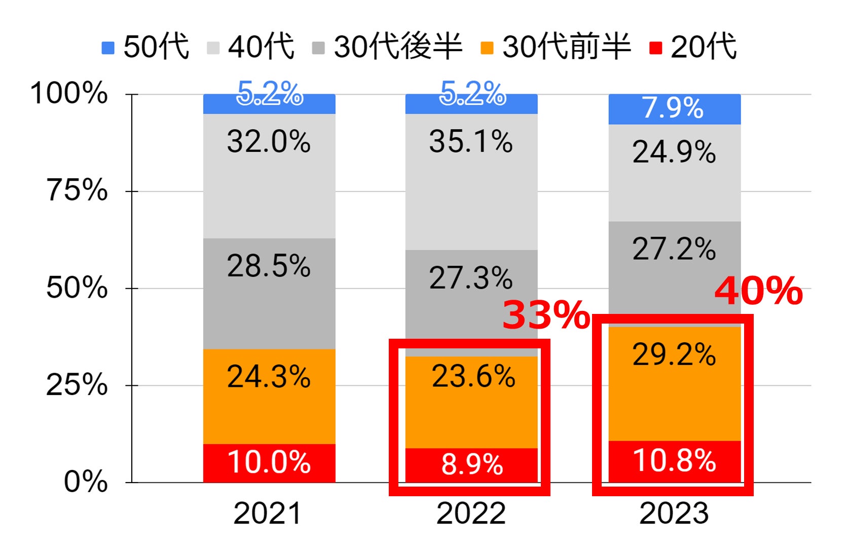 ユーザーは30代がボリュームゾーンであることに変わりはないものの、20代~30代前半が占める割合は2022年の33%から2023年には40%に増加しました。50代も2022年の5.2%から2023年には7.9%へ増加。幅広い世代から選ばれるようになりました。