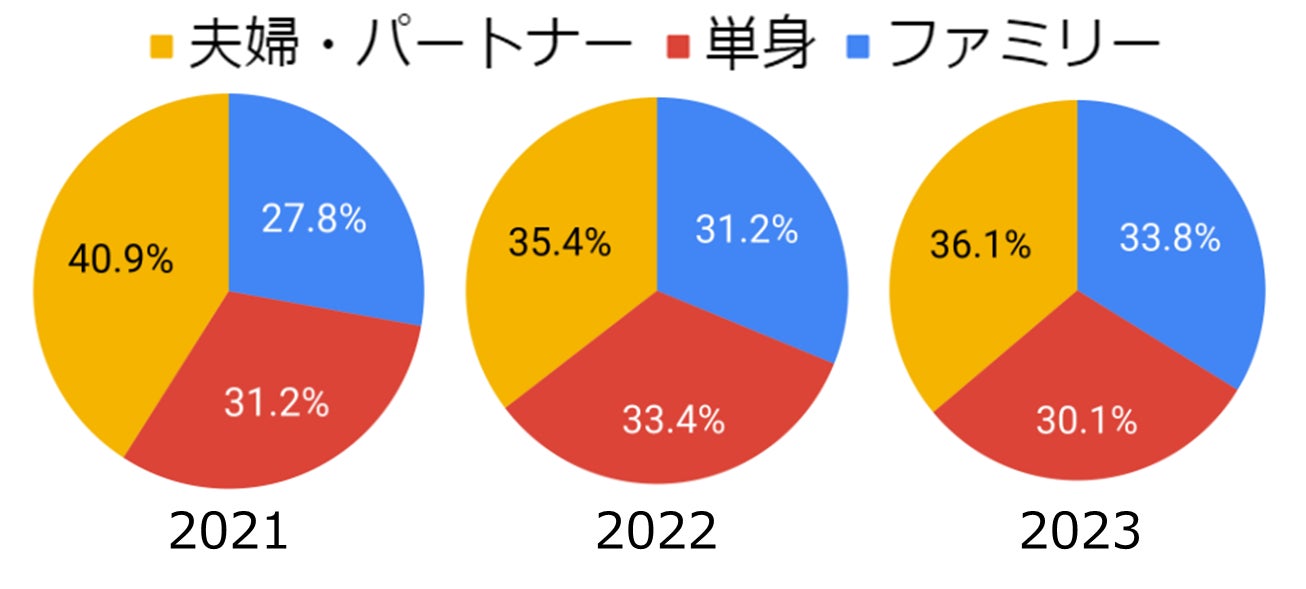 リノベるの2023年の家族構成は、ファミリーが33.8%、単身が30.1%、夫婦&パートナー世帯が36.1%。2021年から比較すると比率は1:1:1に近づいています。