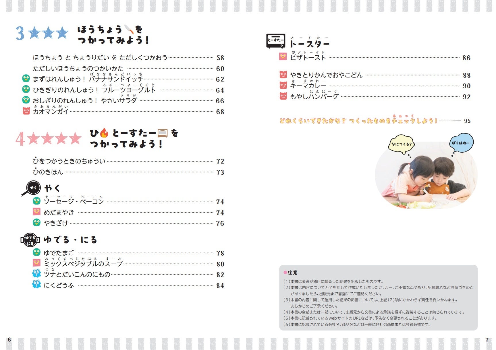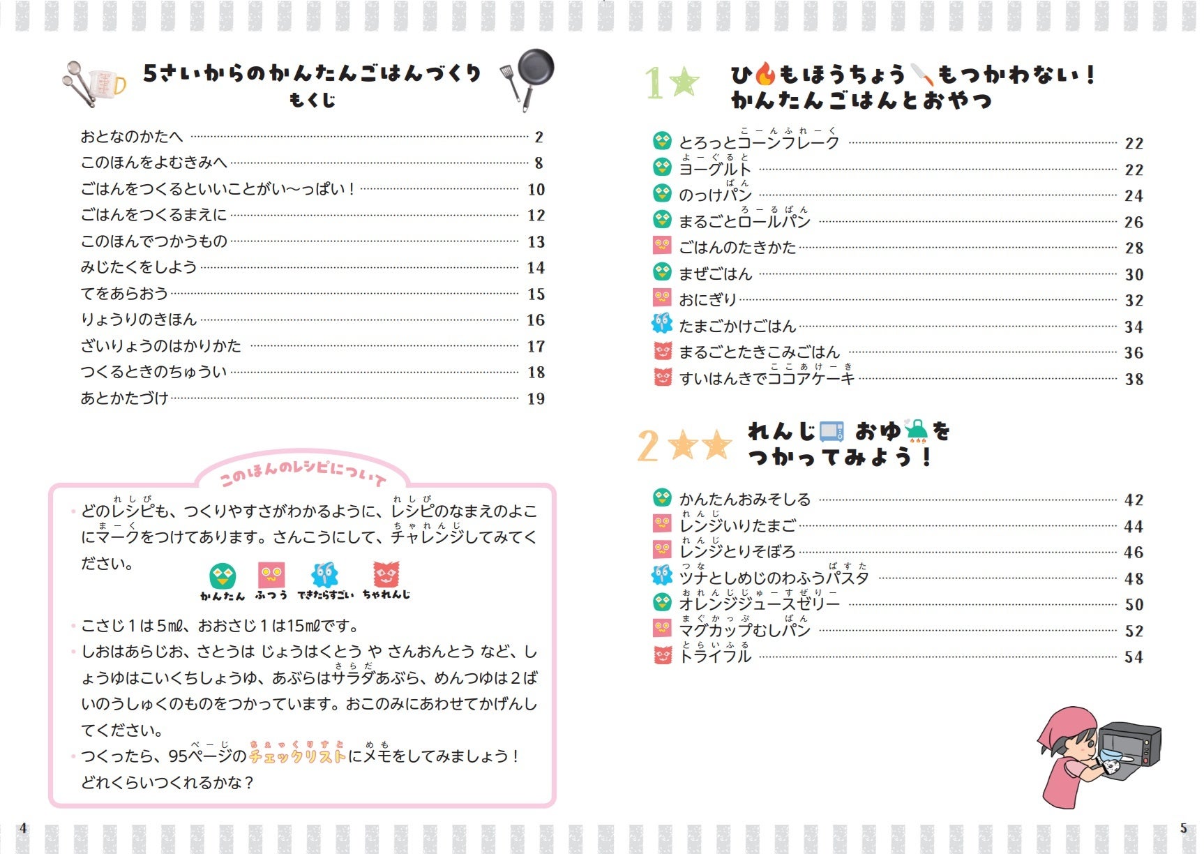 この本では「5歳前後の、料理や食べることに興味を持ったときから」「包丁なども含む正しい料理の基本」を学び、火も包丁も使わず本当に簡単に作れるおやつやごはんから、包丁の扱い方や火を使う料理まで、だんだんステップアップしながら学べる32のレシピを紹介しています。