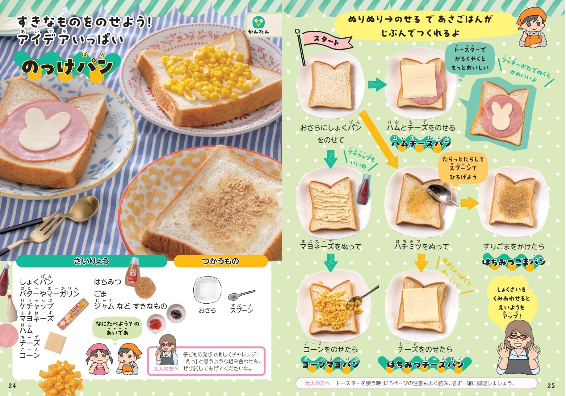 ★のせるだけ・ぬるだけで食べる、混ぜたり巻いたりする、包丁を使う、お湯を使う、レンジを使う、火を使う、など、レベル別にステップアップできる構成