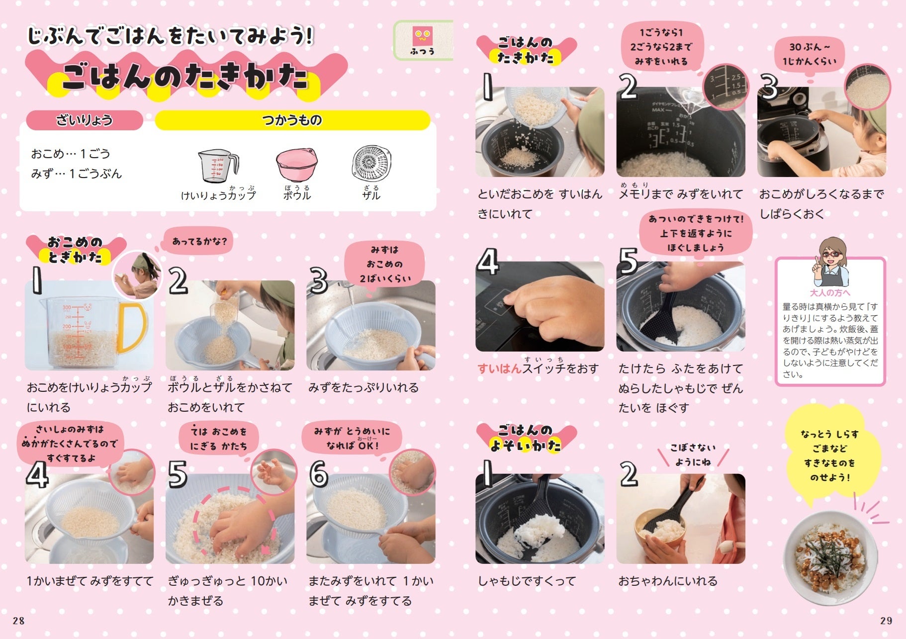 すべてひらがな、カタカナにはふりがなつきで、お子様もひとりで読めるやさしい文章。大人向けの注意点も書いてあるので親子で安心して読めます。