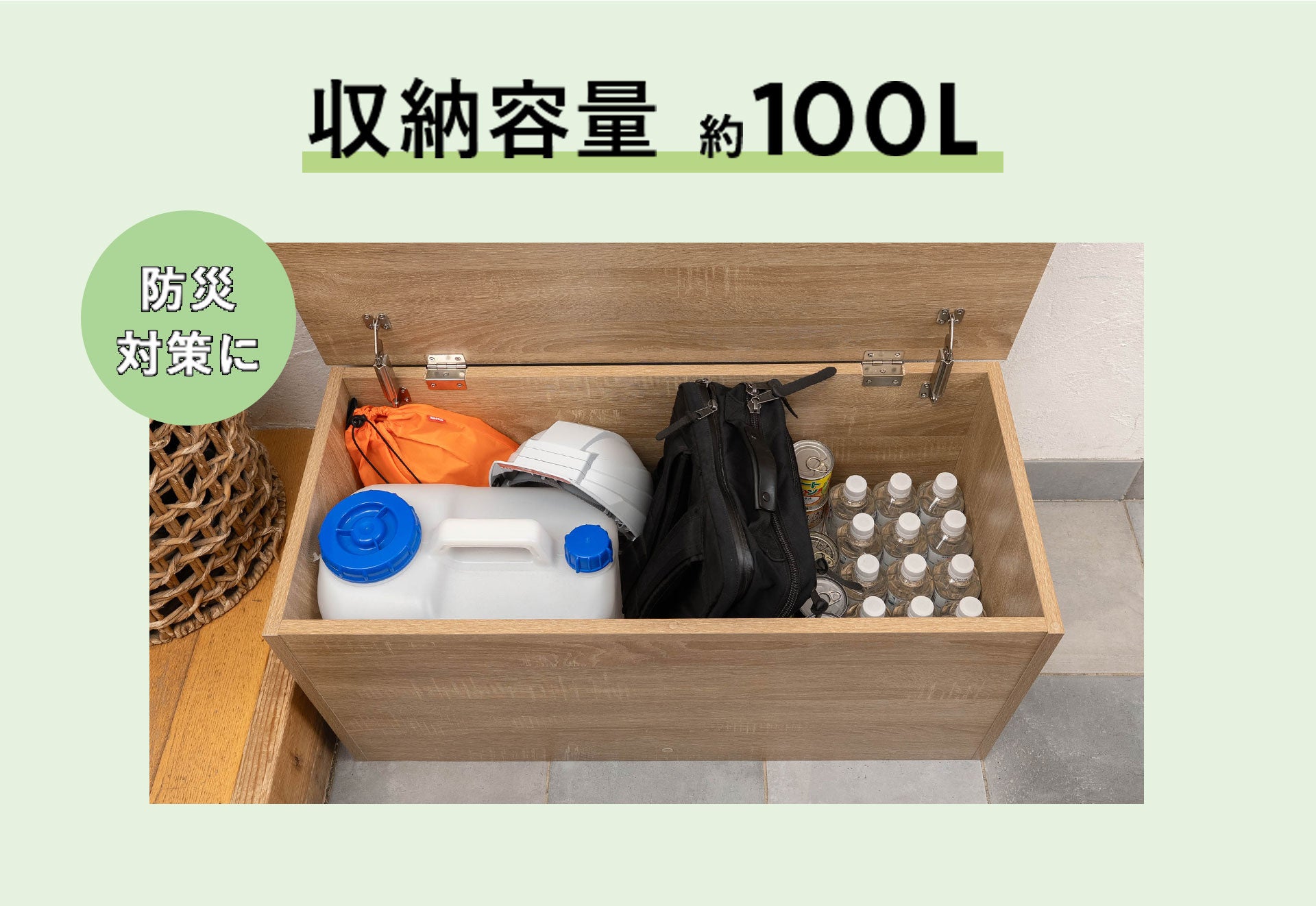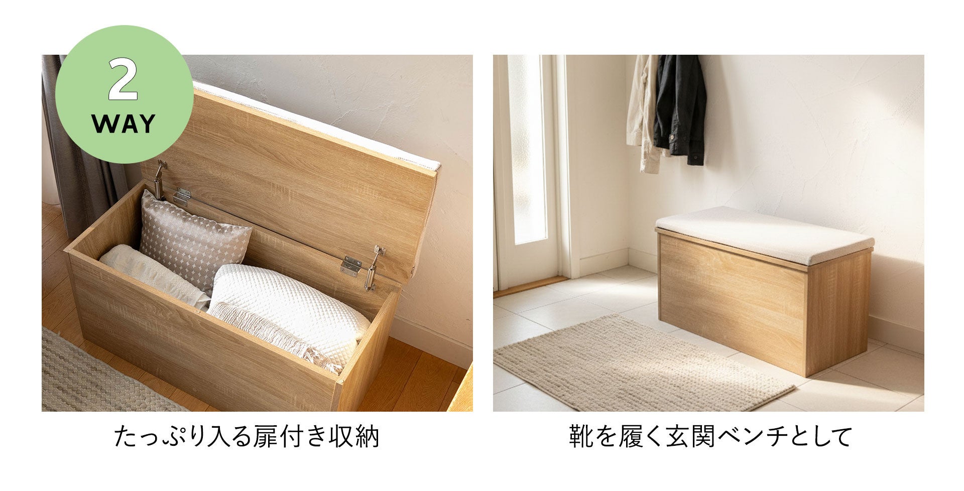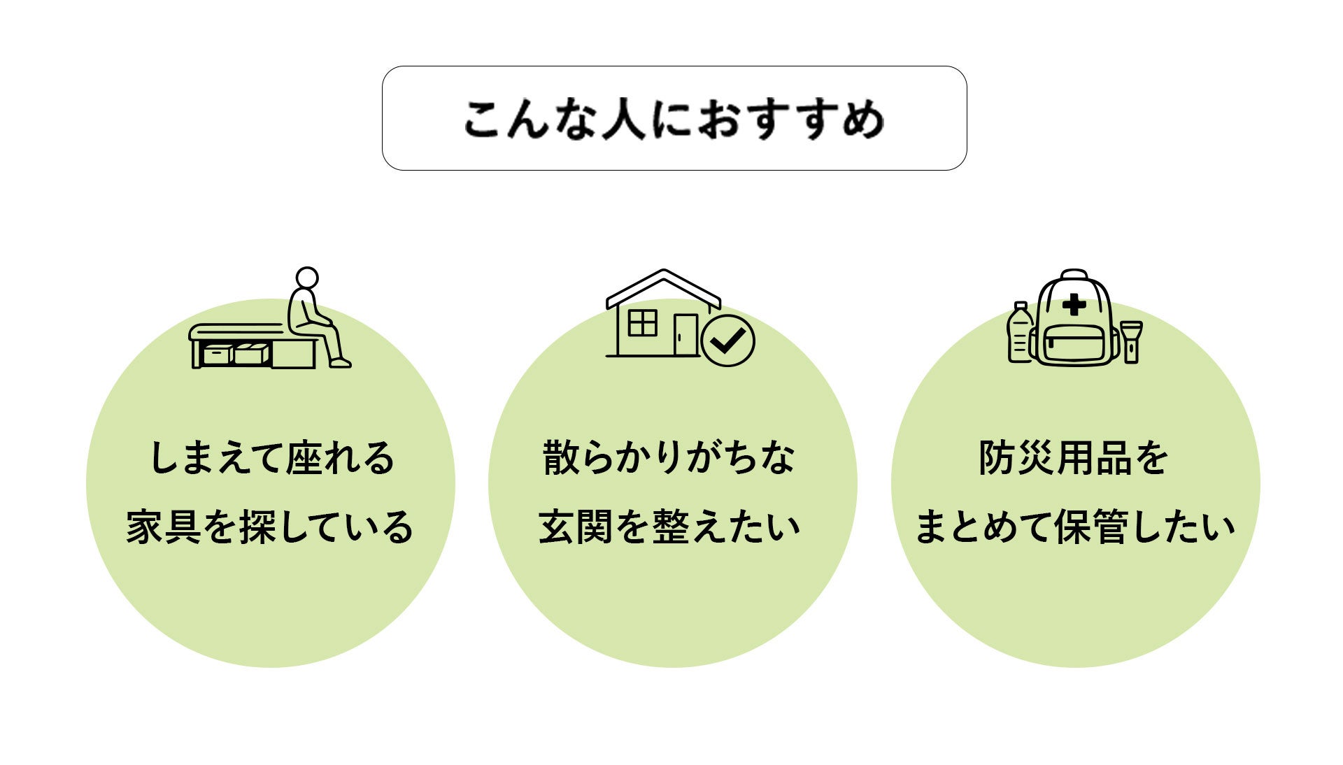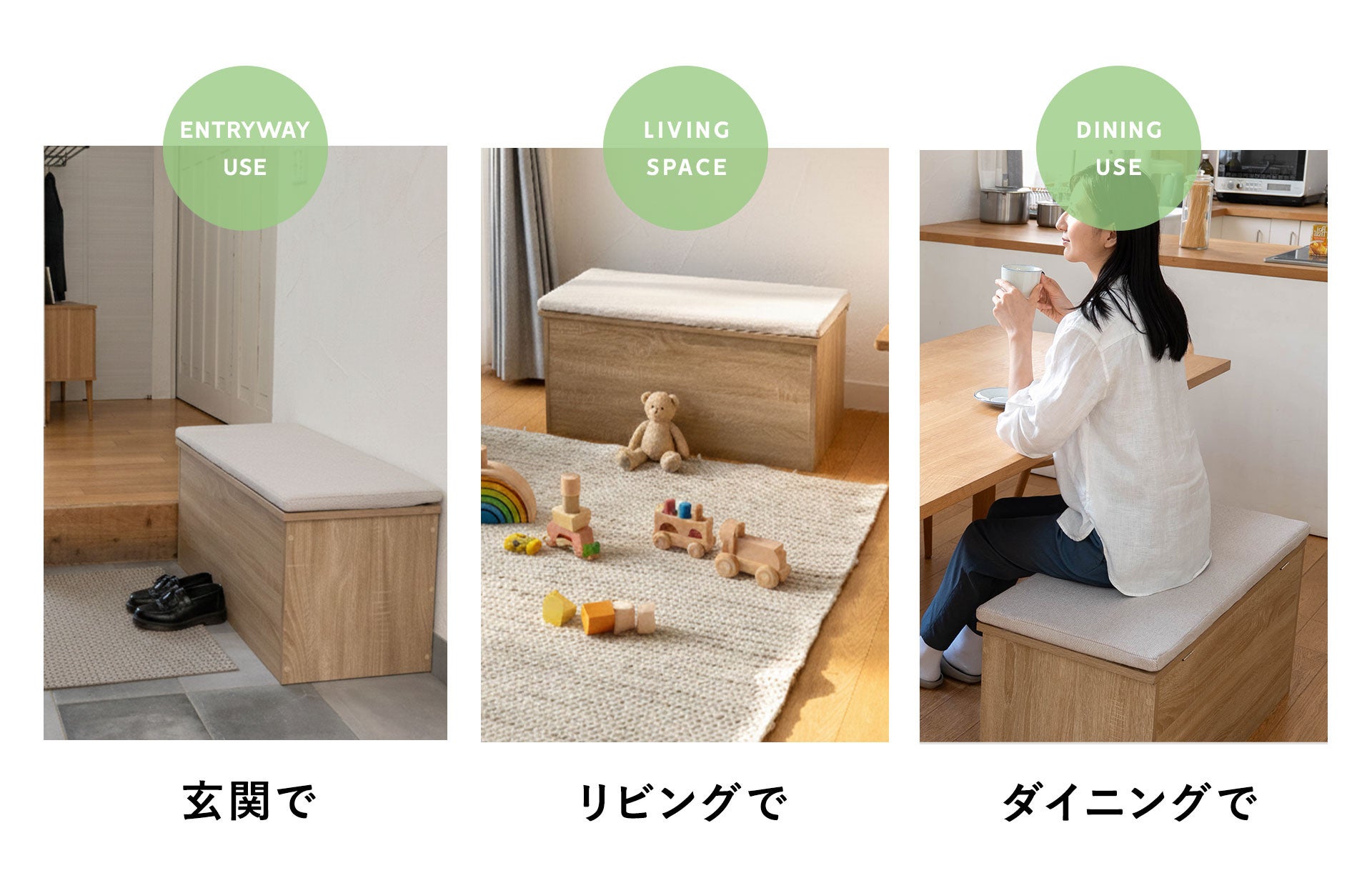 置き場所に困りがちな物をすっきりしまえて、ふだんはベンチとしてさっと座れます。収納スペースが限られている玄関やお部屋など、様々なシーンで活躍します。