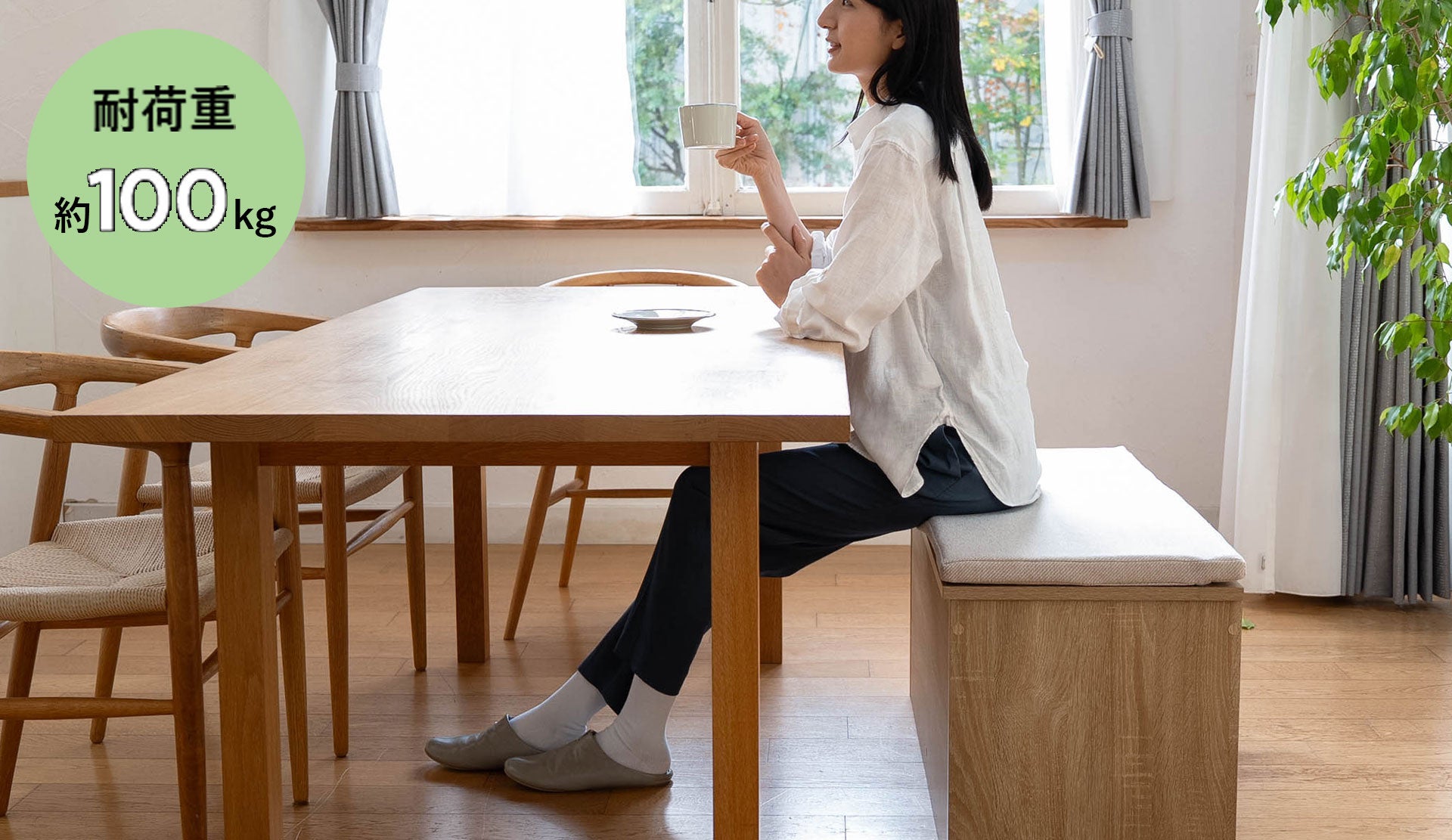 耐荷重約100kgのしっかりとした天板設計で、腰掛けた際もぐらつきにくく、安定感のある使い心地を実現。毎日の使用はもちろん、ゆったりと座りたいシーンでも安心してお使いいただけます。