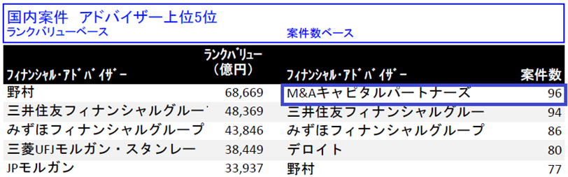 ・1位獲得「国内案件 アドバイザー上位5位 案件数ベース」 ※下記図を参照