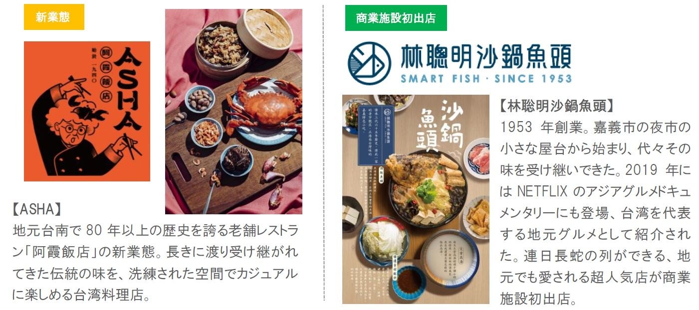 台南の地元老舗レストランの新業態「ASHA」(台湾料理)、台湾南部嘉義県の行列店「林聰明沙鍋魚頭」(魚介煮込み料理)の商業施設初出店等、地元有名店も誘致。地元グルメが商業施設で手軽に楽しめます。