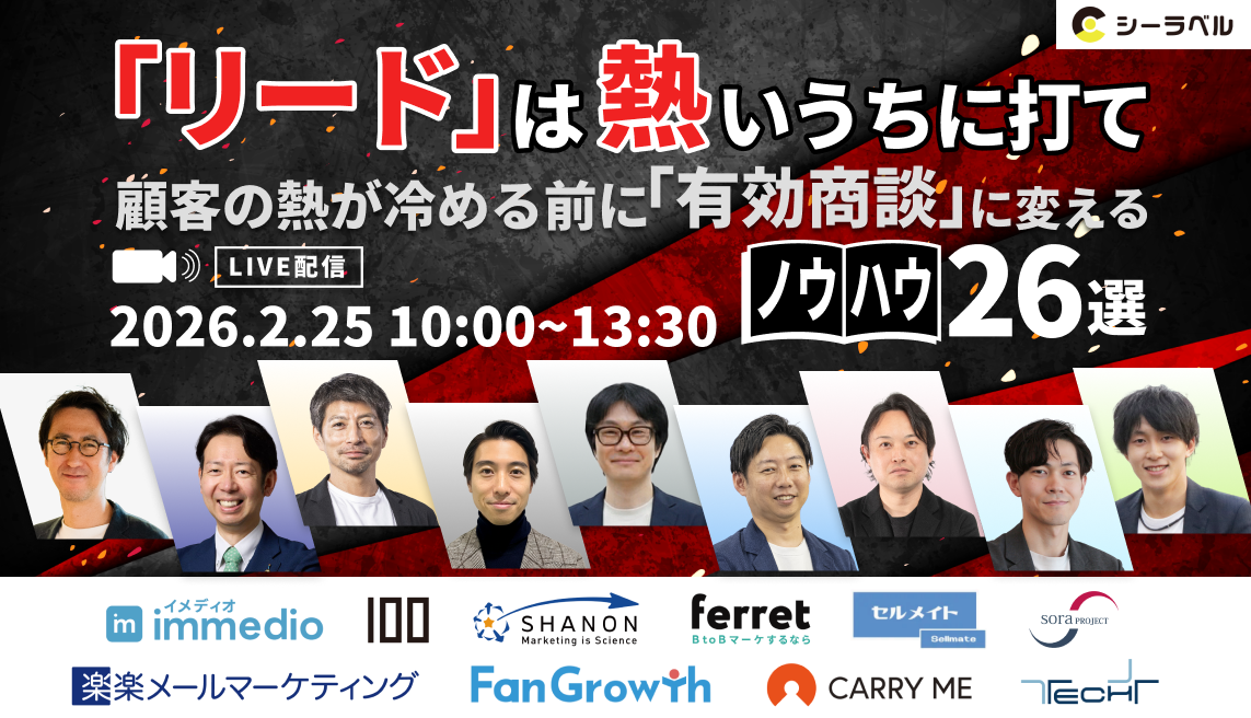 本カンファレンスは、「待たせない」をテーマに、マーケティングおよびインサイドセールス領域の実務を担う企業9社が集結し、リード獲得後の初動対応や顧客選別、ナーチャリング設計など、商談化に直結する実践知を共有する場です。主催は株式会社シーラベル。参加費は無料で、ライブ配信後にはアーカイブ配信も予定されています。