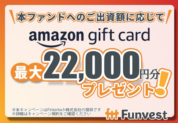本ファンドへ出資していただいた投資家の皆様を対象として、出資額に応じて最大22,000円分のAmazonギフトカードをプレゼントするキャンペーンも併せて実施いたします。