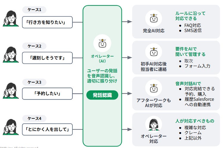 誤情報を返さない独自技術 "ハルシネーションゼロ" により、業務自動化の信頼性も担保。オートコールと有人対応とのハイブリッド運用にも対応し、通話データを起点とした継続的な業務改善と、データドリブンな意思決定を支援します。