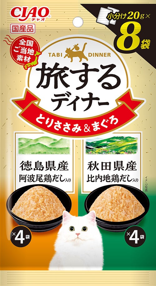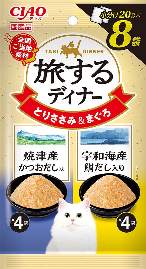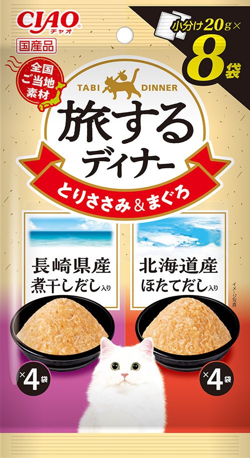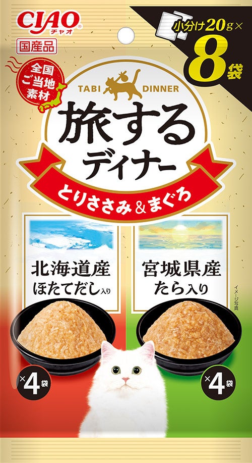 いなばペットフード株式会社(いなば食品グループ 本社:静岡県静岡市清水区由比)は、全国ご当地素材を使用した猫ちゃん向けフード「CIAO 旅するディナー」を新発売いたしました。全国各地の本格的なご当地の味を体験できるとご好評の「CIAO 旅するディナー」に、新たにお食事として楽しめるディナータイプが登場です。まぐろととりささみを風味豊かな魚介や鶏の素材で仕上げたゼリータイプの一品です。