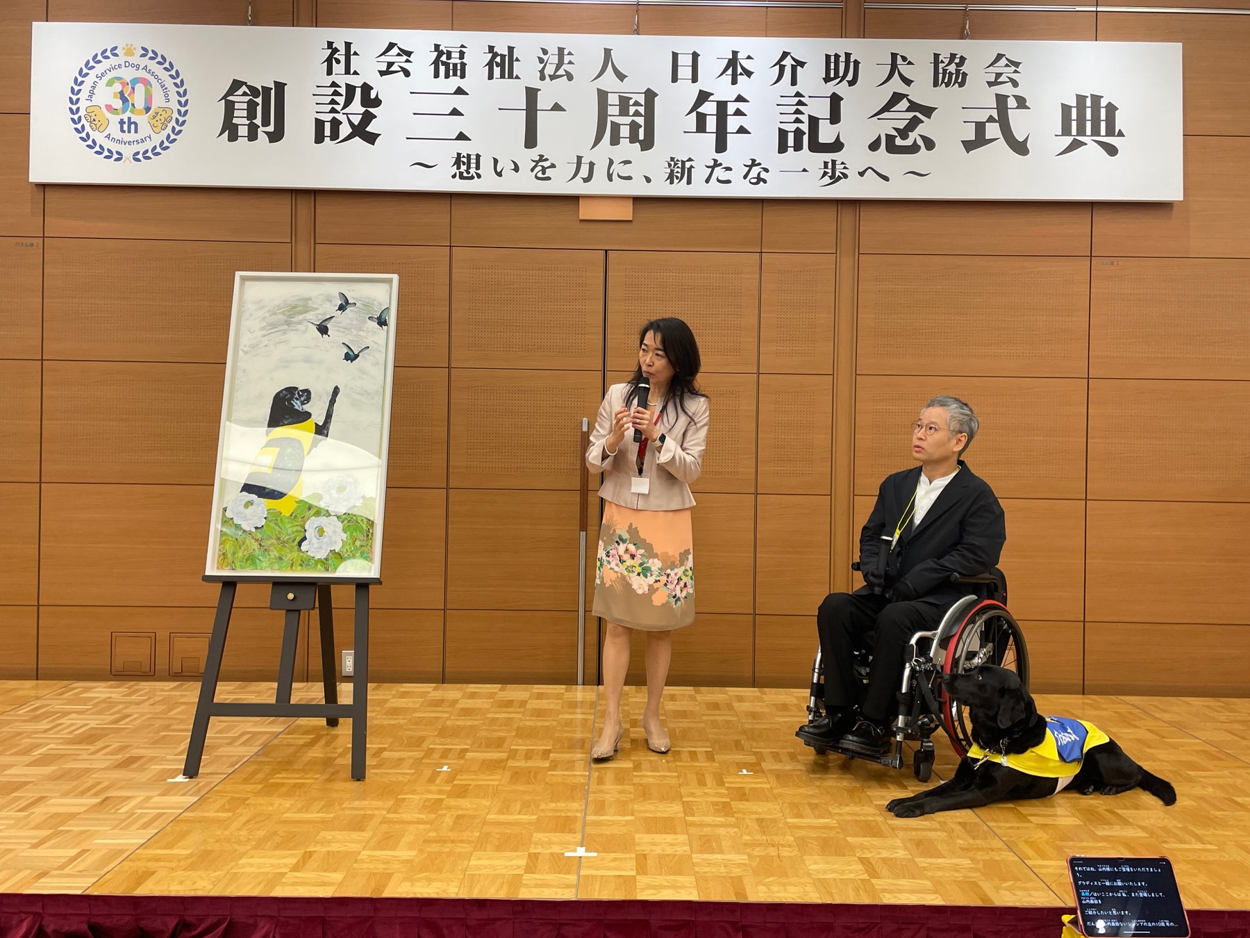 また30周年記念寄贈では、今回の30周年に向けた介助犬使用者 山内稔氏の絵画「介助犬と夢の中へ」が協会に贈られ、ジュディ・オング氏からのメッセージ動画も上映された。