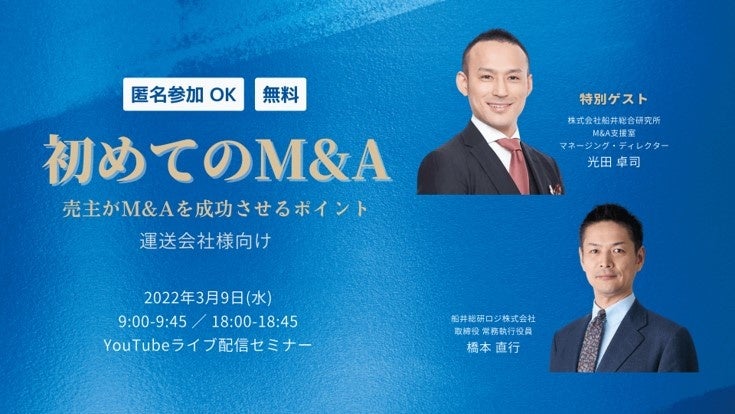 物流企業向けコンサルティングサービスを提供する船井総研ロジ株式会社(東京本社:東京都千代田区、代表:菅重宏、以下「船井総研ロジ」)は、運送・物流企業の経営者向けのYouTube LIVEセミナー「初めてのM&A ~売主がM&Aを成功させるポイント~」を開催いたします。