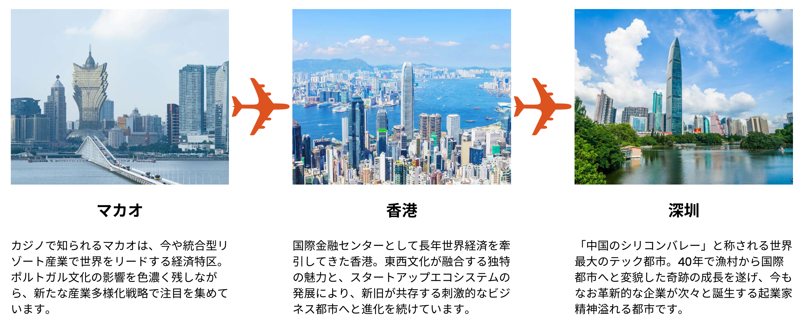深圳は「中国のシリコンバレー」と呼ばれ、テンセントやBYDなど世界的企業が集積する都市であり、香港は国際金融のハブ、マカオは国際展示会拠点として機能しています。