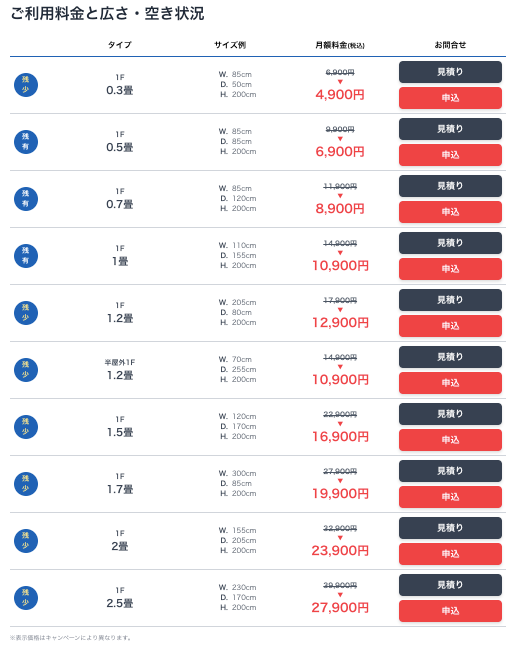 - 部屋タイプとサイズ、月額料金はこちら