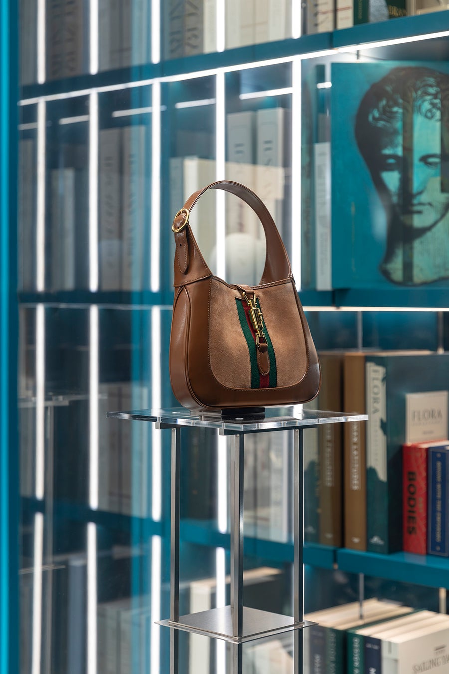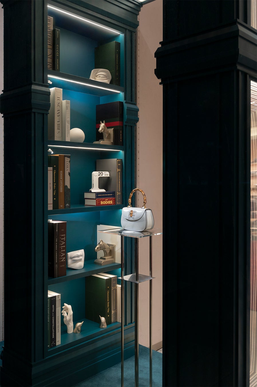 ウィンドウの中心には、光と鏡の途切れることのない相互作用によってどこまでも続いているように見える空間が生まれ、人々をさらに奥まで覗き込むように誘います。鏡張りのブックシェルフには、書籍や小さな彫像、グッチのアーカイブ モチーフを象ったブックエンドが美しく調和しながら並べられています。この入念にキュレーションされたウィンドウは、オブジェとその果てしなく続く反射を通じて、グッチのクリエイティブな宇宙を詩的に表現しています。