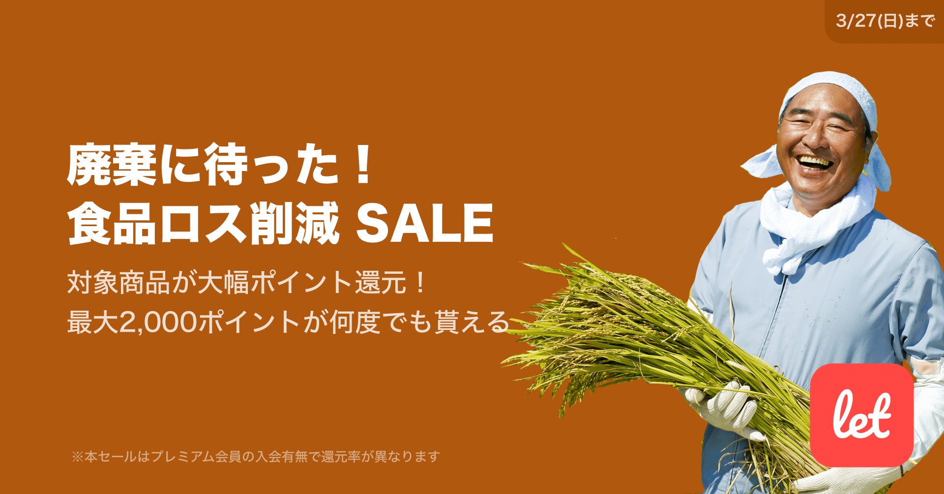 株式会社レット(本社:東京都港区、代表:佐藤 航陽)が運営する、食品ロス/在庫ロス削減のマーケット「Let(レット)」内で「廃棄に待った!食品ロス削減 SALE」を3月25日(金) 18:00より開催します。期間中、プレミアム会員様限定で対象の食品をご購入いただくと、2,000ポイントを上限にポイントを大幅還元いたします。期間中のご購入であれば、ポイント還元はお一人様あたり何度でもご利用いただけます。