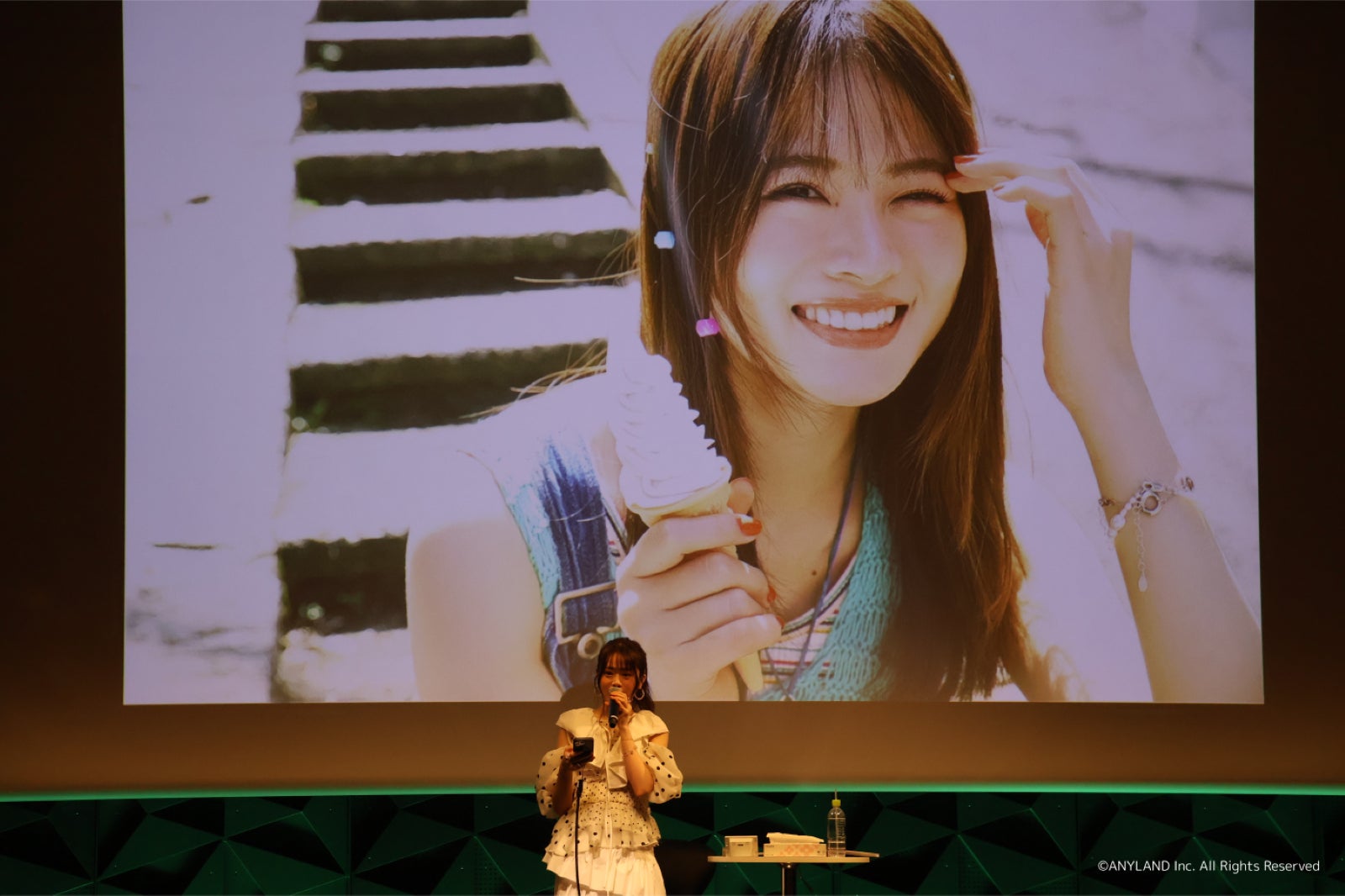2部では、2025年2月以降に撮影された写真が中心に登場。SNS未掲載のレアショットも多数お披露目され、学生時代の友人とのランチ写真や、大食い番組収録時のオフショットなど、“素のれなち”を感じられる時間となりました。そんな特別なひとときを味わえるのも、ファンクラブイベントならではの醍醐味です。