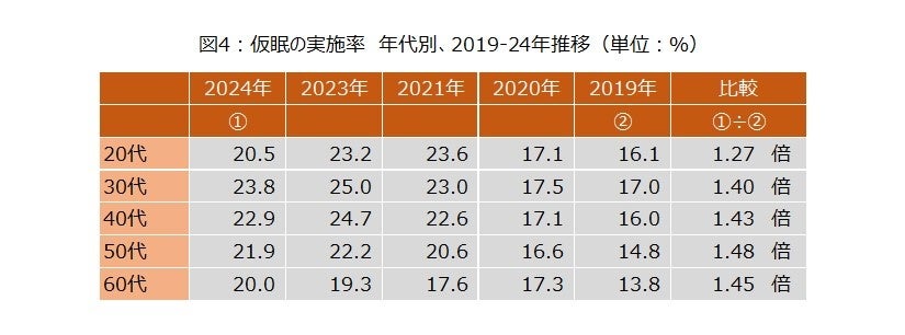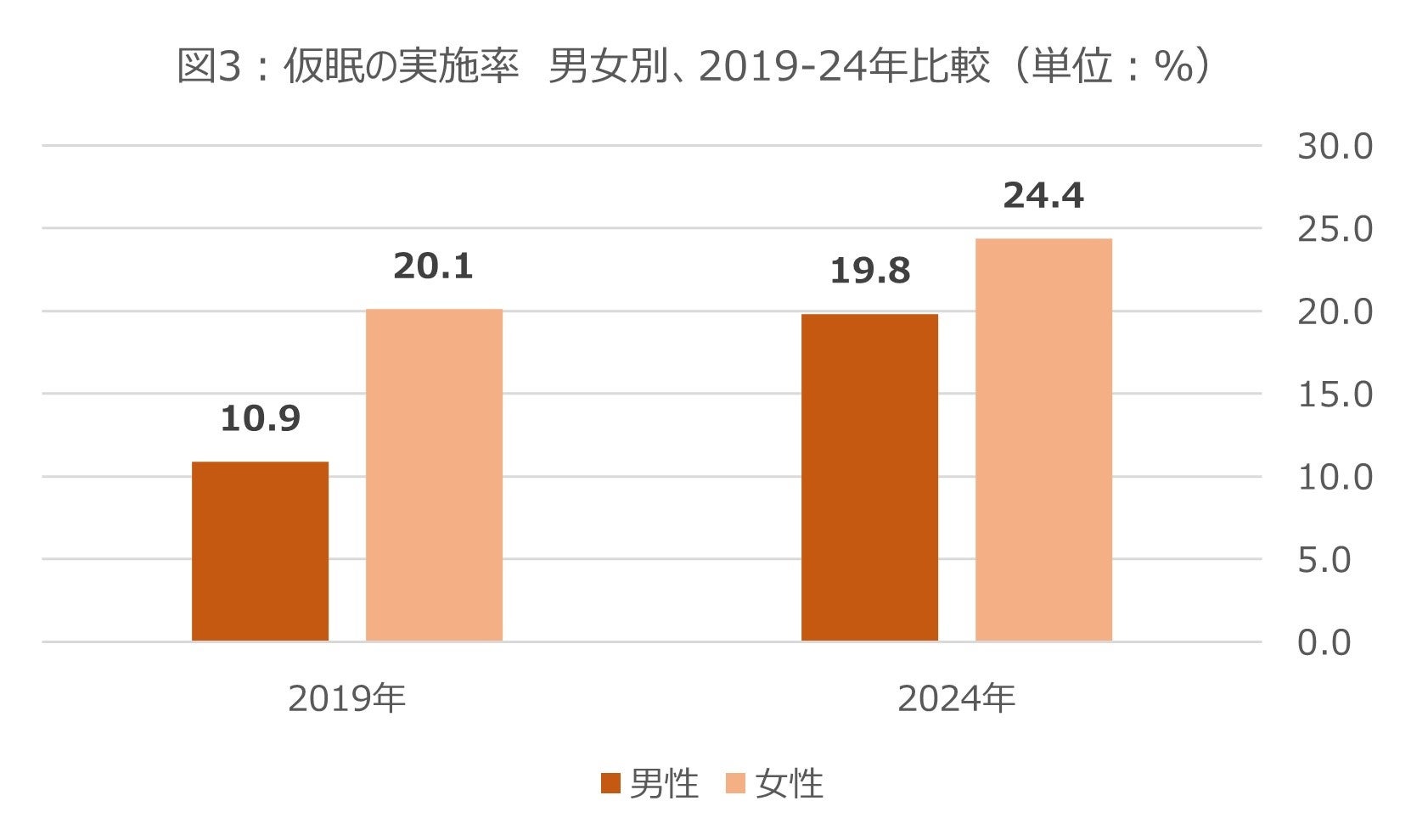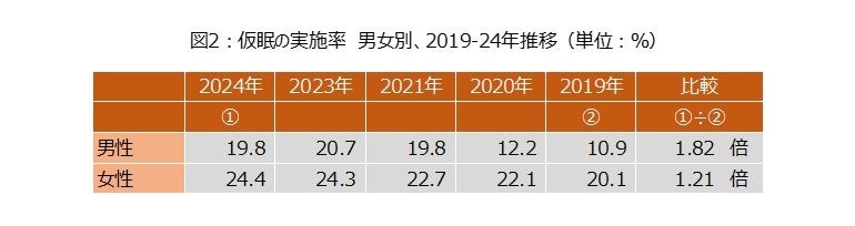 男女別に見ると、毎年女性が男性よりも「仮眠」を取る人が多いものの、コロナ前2019年から2024年の上昇率は女性が1.21倍、男性が1.82倍と男性でより増えていることが分かります。