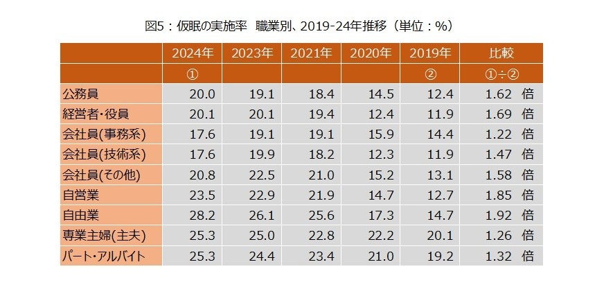 職業別の「仮眠」実施率を見ると、2019年では専業主婦(主夫)が最も多かったのが、2024年は自由業(フリーランス)の方が最も多く、併せて2019年と比較した時の増加率もトップになっています。その他、自営業や経営者も増加率は高く、積極的に「仮眠」を取り入れていることが分かります。