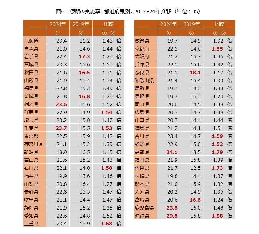 〈都道府県別 2019-2024年「仮眠」実施度上昇率ランキング〉