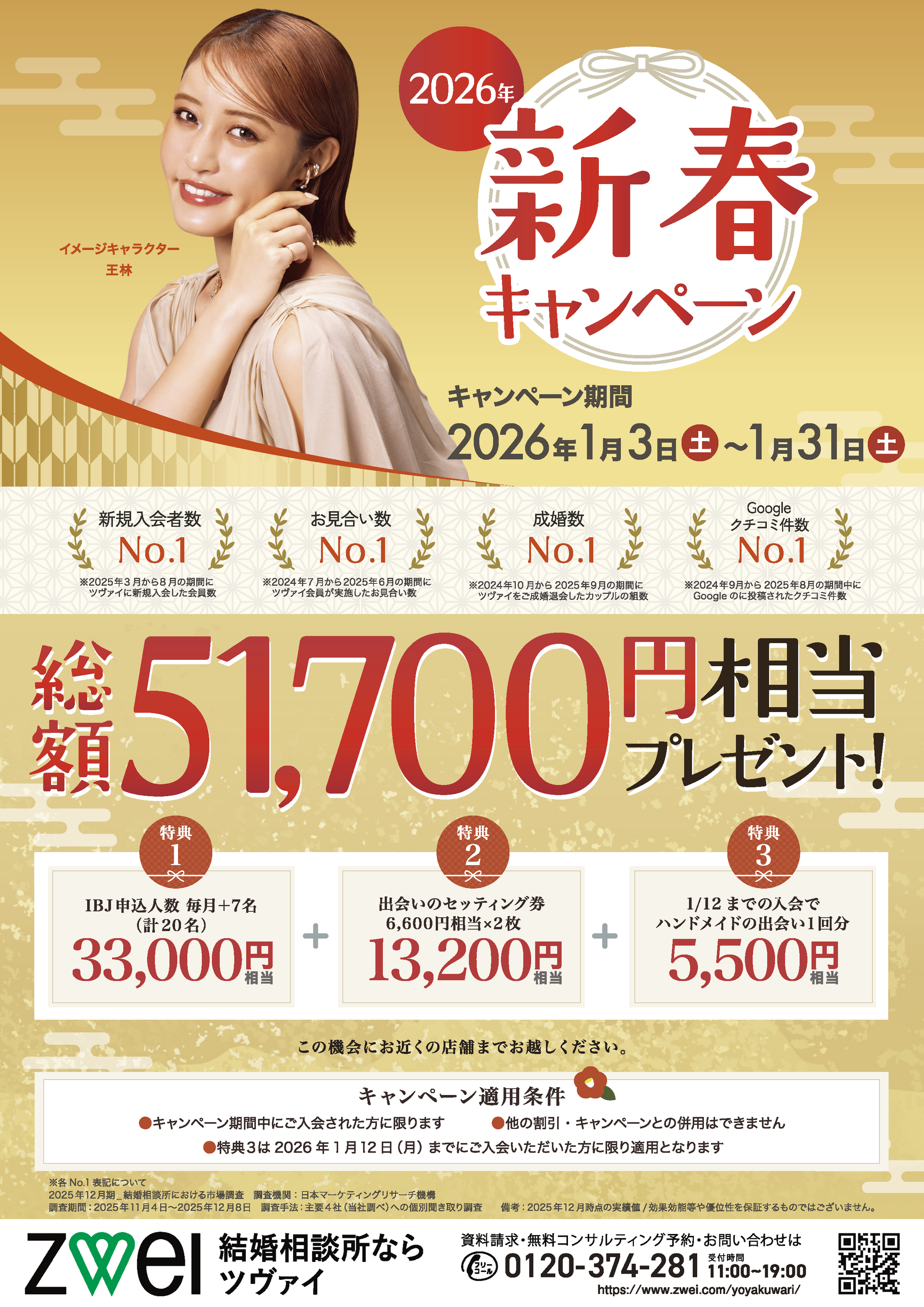 ZWEIでは皆様の2026年の婚活を応援するため、2026年1月3日(土)より「新春キャンペーン」を実施いたします。