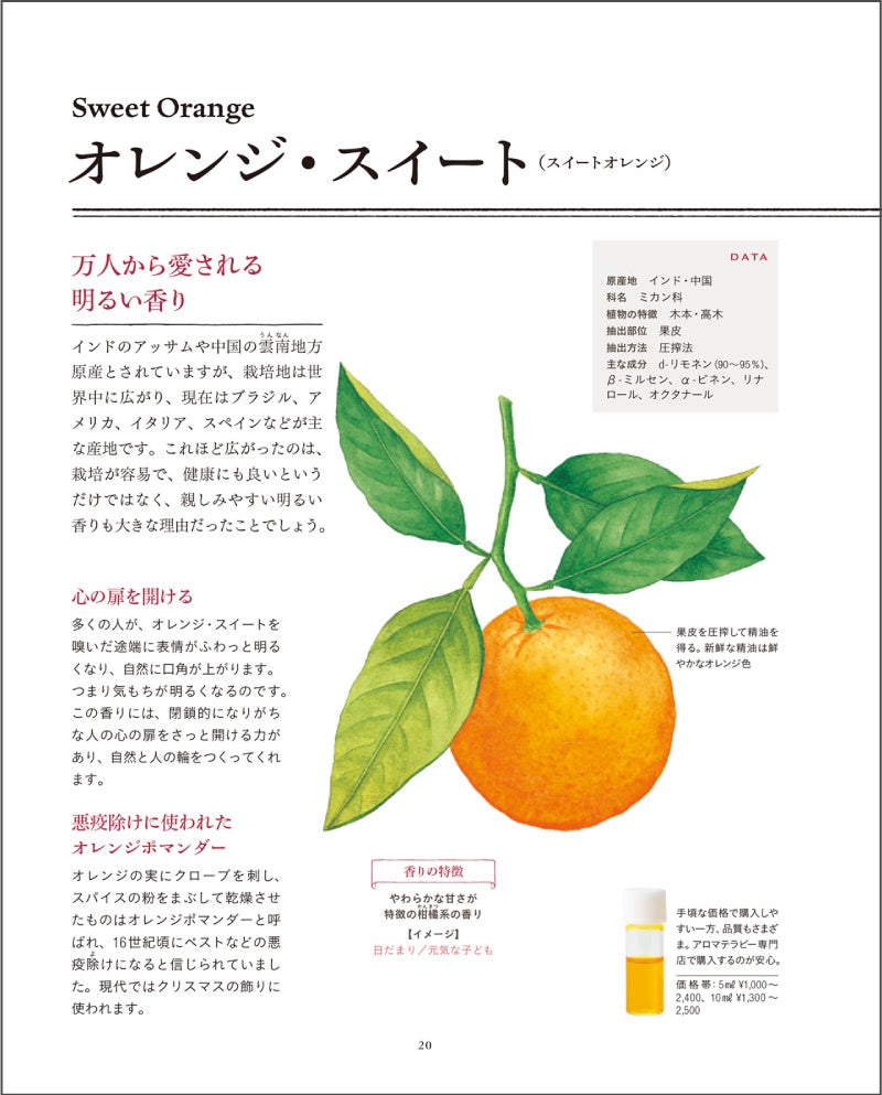 本書では海外精油はもちろん、日本精油の最新情報もたっぷり詰め込みました。第1章は美しい植物画とともに、ラベンダーやレモンなど海外の精油(68種)、第2章ではユズやヒノキなど日本の精油(18種)を紹介。成分や香りの特徴、効用等の基本情報はもちろん、精油にまつわる歴史や雑学など、パッと開いたページを読むだけでも楽しい内容です。