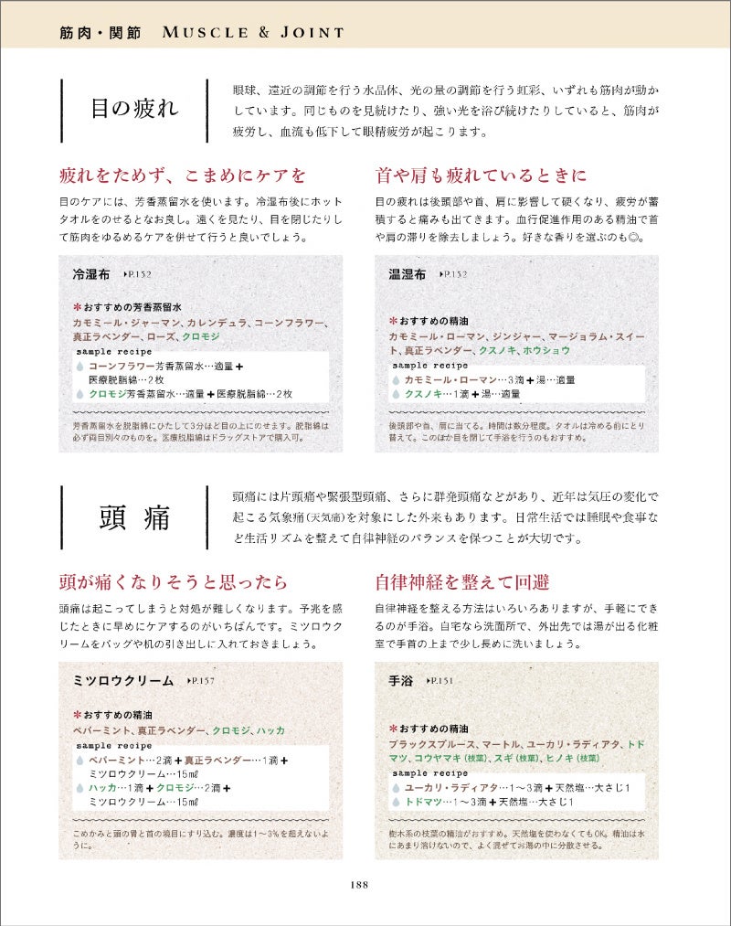 巻末には実生活で使いやすい「分類別のレシピ」をまとめています。「睡眠のトラブル」などのストレス・メンタルケア、「肩こり」などの筋肉・関節や、「風邪」などの免疫・呼吸器のケアなど。自分に必要なレシピが見つかります。