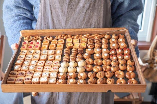 本物の約1/16と1/4サイズ、パンの質感と触り心地のよさ、コロンとした可愛さが魅力。全て表情が違う手づくりなので、お気に入りを見つけてください。