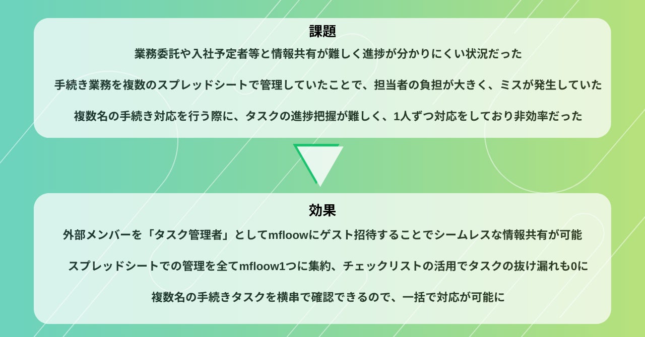 そのなかで、「mfloow」は部署や社内外を横断して業務を行うバックオフィスに特化しており、タスクや進捗が一元管理できる点や、委託先の担当者や入社前のメンバーなど初めて利用する人でも直感的に分かりやすいシンプルさを評価いただき導入に至りました。