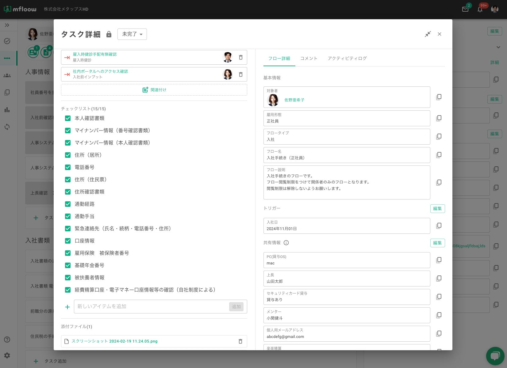入社・退社のタスクが進めば、次のタスクの担当者に連絡が必要です。「mfloow」ならタスク完了をクリックで操作可能、次のタスクの担当者へ自動で通知することで連絡漏れによる遅延を防ぎます。