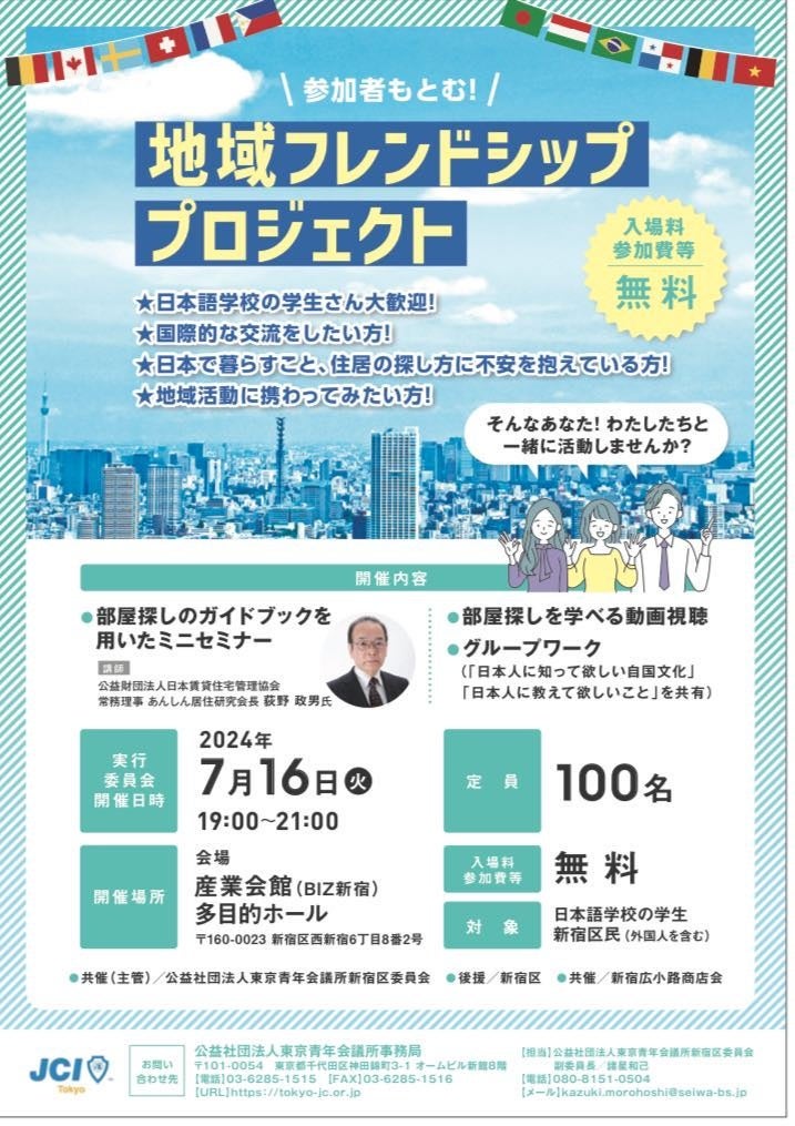 今年は「日本で暮らす外国人に、不自由さを解消してもらうこと」を目的に、①外国人の方が日本で暮らすためのお部屋探しを学べるセミナー「地域フレンドシッププロジェクト」と、②日本人と外国人がともに楽しめる「新宿多文化共生祭り」を企画します。どちらも参加費無料です。