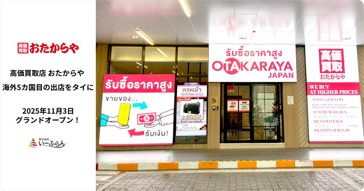 株式会社いーふらん(本社:神奈川県横浜市、代表取締役社長 鹿村大志、以下「いーふらん」)は、2025年11月3日(月)、いーふらんが展開する高価買取店「おたからや」を、タイ・バンコクの商業施設「DONKI Mall Thonglor(ドンキモール・トンロー)」に新規出店いたしました。これにより、「おたからや」の海外展開は5カ国目となります。