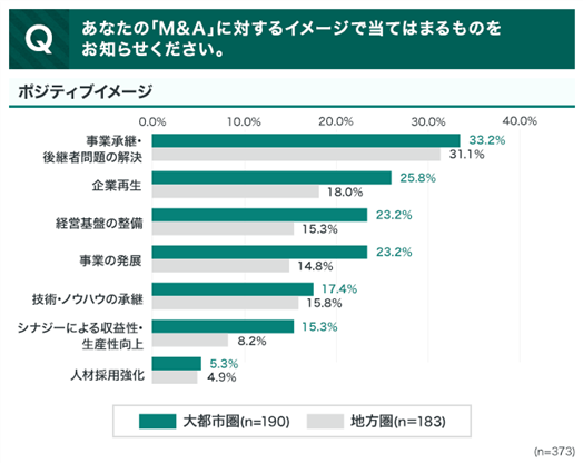 大都市圏、地方圏の経営者では共に、ポジティブなイメージとして「事業承継・後継者問題の解決」の回答が上位に挙がるのに対し、「シナジーによる収益性・生産性向上」「人材採用強化」などその他の項目についての回答は少ない結果になりました。M&Aで得られるメリットについて、十分に理解がされていない様子が伺えます。