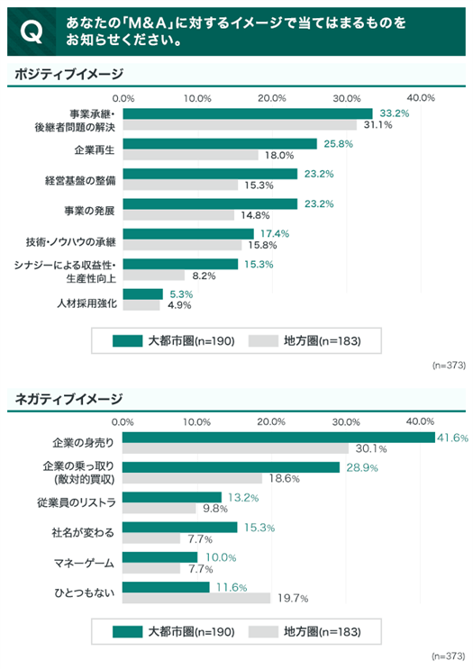 一方、ネガティブイメージとしては「企業の身売り」「企業の乗っ取り」など依然として敵対的買収のイメージを持つ経営者が多く、友好的M&Aの認知を広める必要性を示唆する結果になりました。