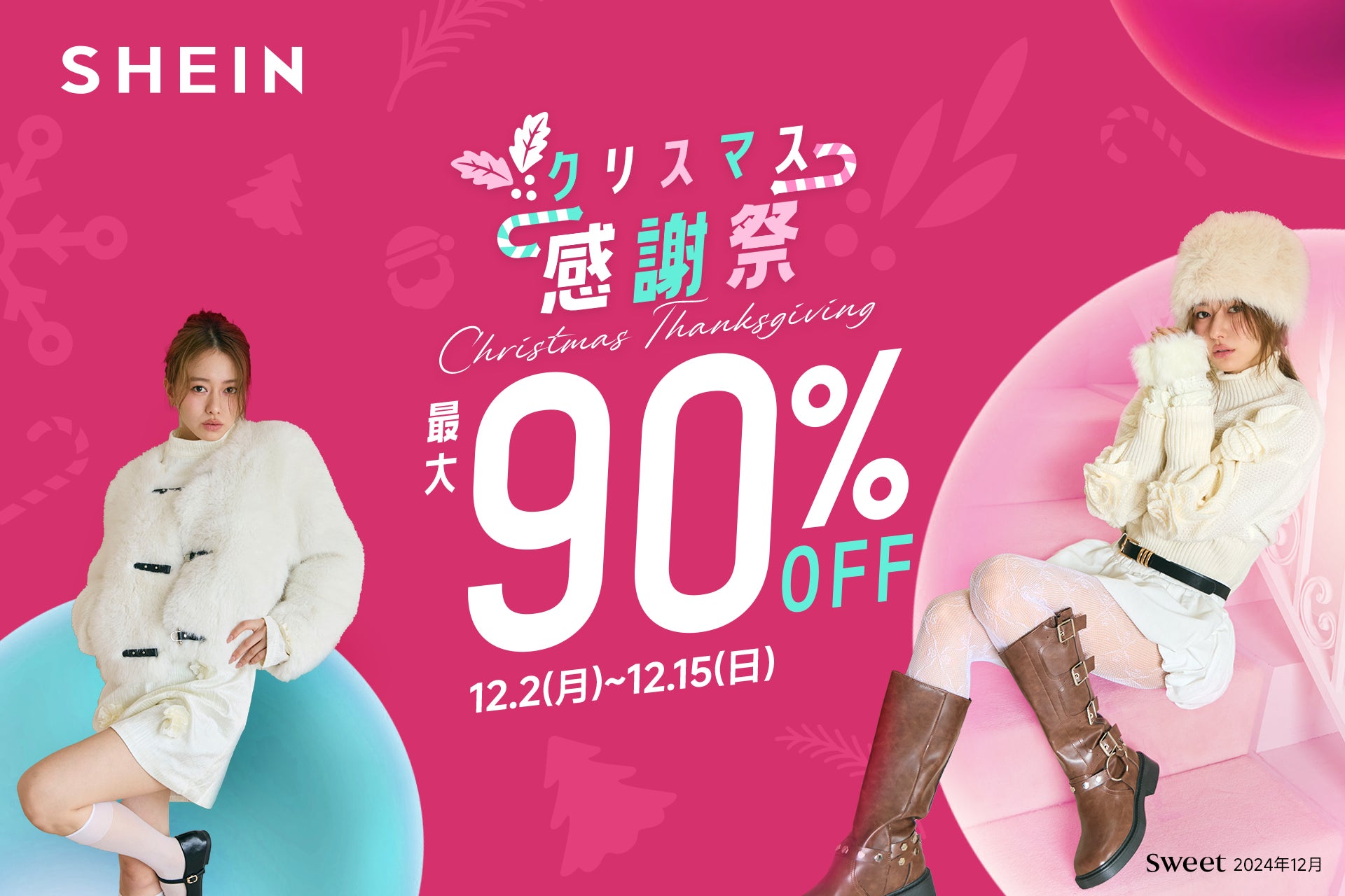 同日より、『#SHEINクリスマス感謝祭』を開催いたします。年に一度の大感謝セールでは、最大90%OFFなど特別な特典をご用意しており、ホリデーシーズンをお得にお楽しみいただけます。感謝祭では、山本舞香さんとのタイアップによるホリデースタイルのLOOKも公開予定です。年に一度の大感謝セールをお見逃しなく、SHEINで素敵なホリデーアイテムを手に入れ、より楽しいクリスマスシーズンをお過ごしください。