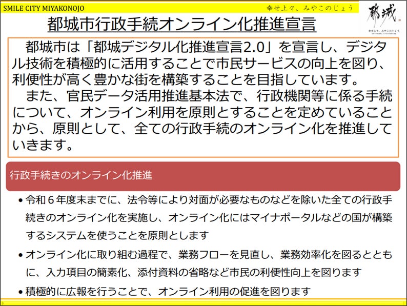 都城市では、令和6年1月に都城市行政手続オンライン化推進を宣言。マイナポータルなどの国が構築するシステムを使い、令和6年度末までにオンライン化可能な全ての行政手続のオンライン化を実施することとしていました。