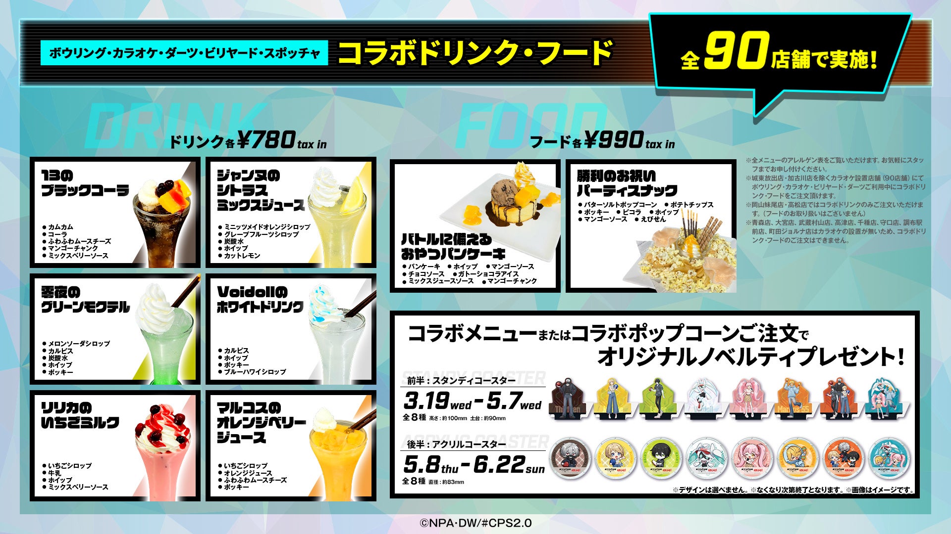 全国のROUND1内のボウリング・カラオケ・ダーツ・ビリヤード・スポッチャの90店舗にてコラボメニューを販売いたします。対象メニューをご注文いただいたお客様には、オリジナルノベルティをプレゼントいたします。