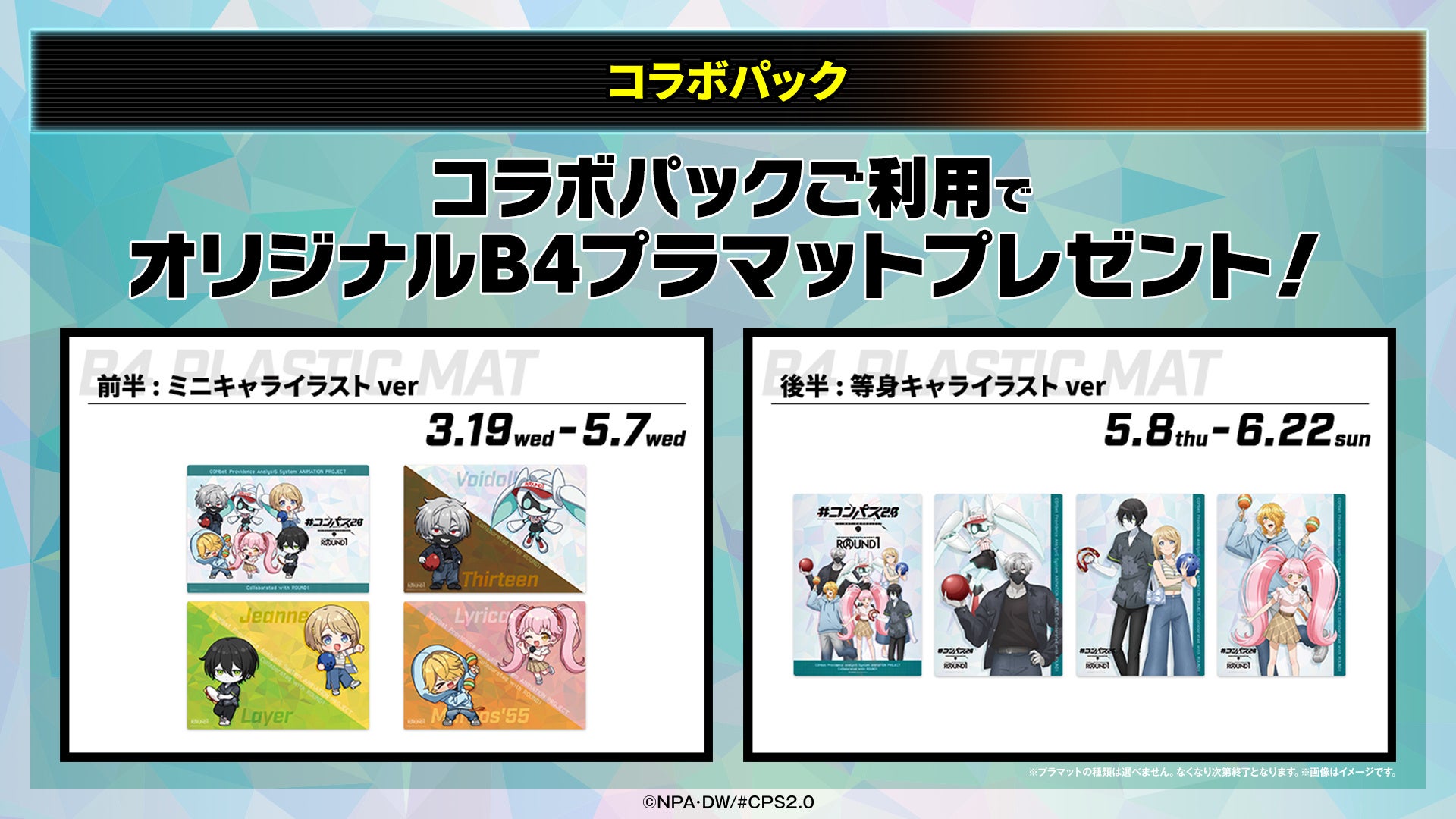 全国のROUND1内のボウリング98店舗、カラオケ92店舗、スポッチャ54店舗、ビリヤード47店舗、ダーツ75店舗でコラボパックを販売いたします。コラボパックで施設をご利用いただいたお客様にはオリジナルB4プラマットをプレゼントいたします。