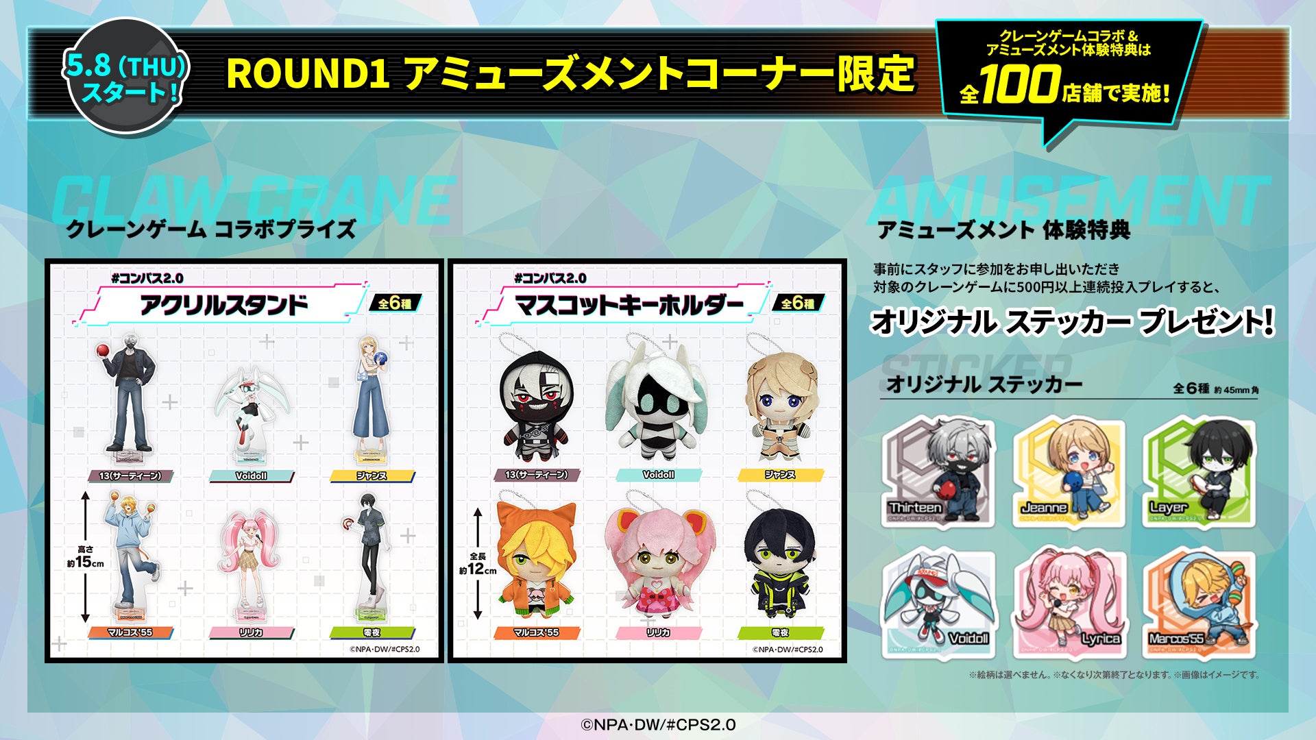 5月8日(木)より全国のROUND1 100店舗にて、「#コンパス2.0 」の新作プライズを展開いたします。また、対象のクレーンゲームに500円を投入すると、コラボ限定描き起こしイラストを使用したオリジナルステッカーがもれなくもらえるマストバイキャンペーンを実施いたします。