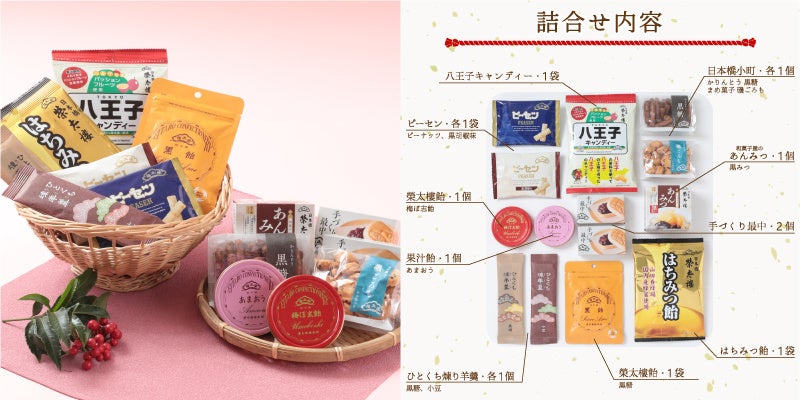 人気商品を少しずつ詰め合わせた全13種14個の特別セットは、手軽にお召し上がりいただける榮太樓伝統の製法で仕立てた「ひとくち煉羊羹」、南蛮渡来「有平糖」の製法で作られた「榮太樓飴」、榮太樓自慢のロングセラー商品「あんみつ」など、榮太樓ならではの魅力がぎゅっと詰まったラインナップ。また、今年の福箱には「八王子キャンディー」も新登場です。