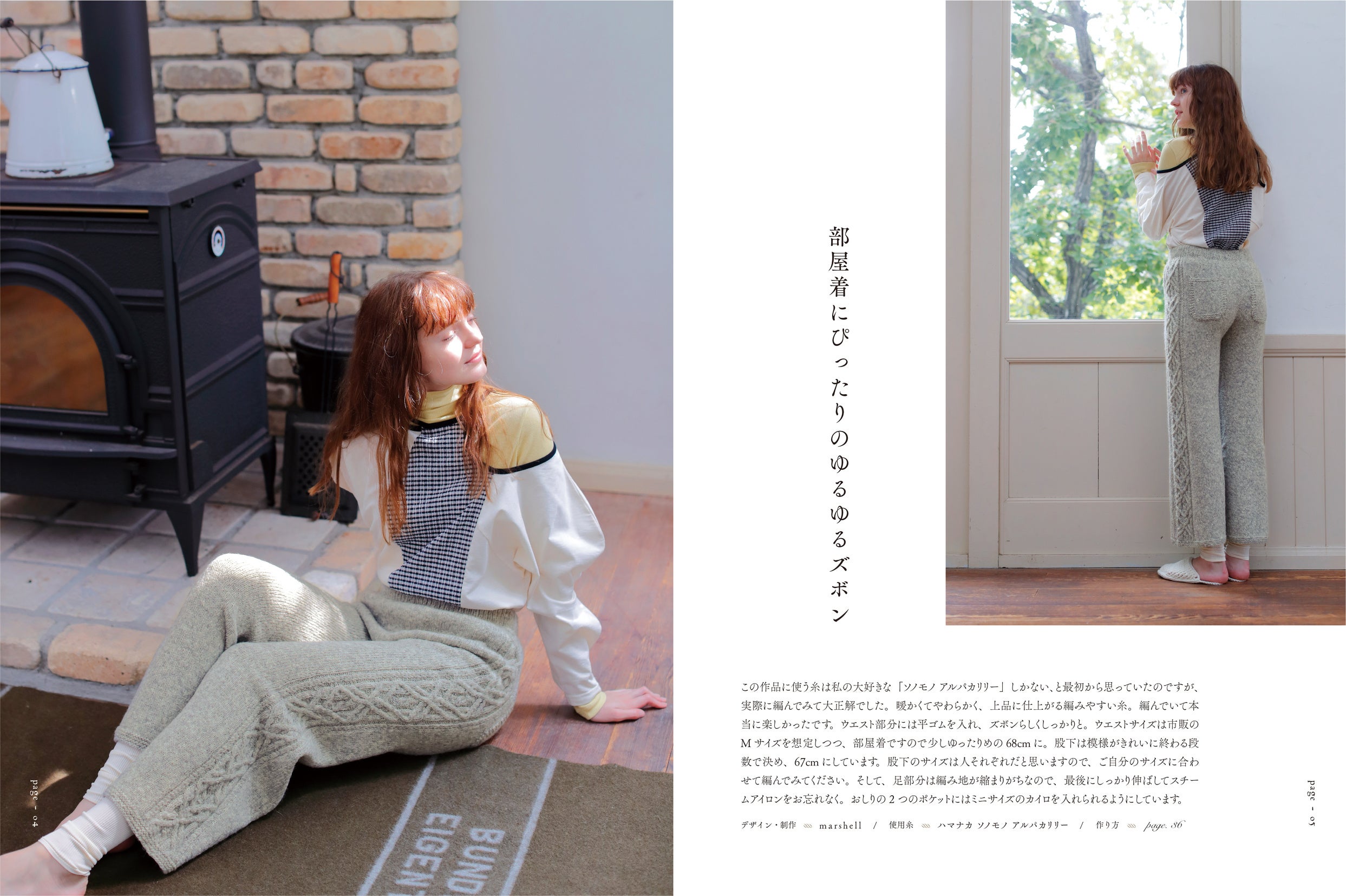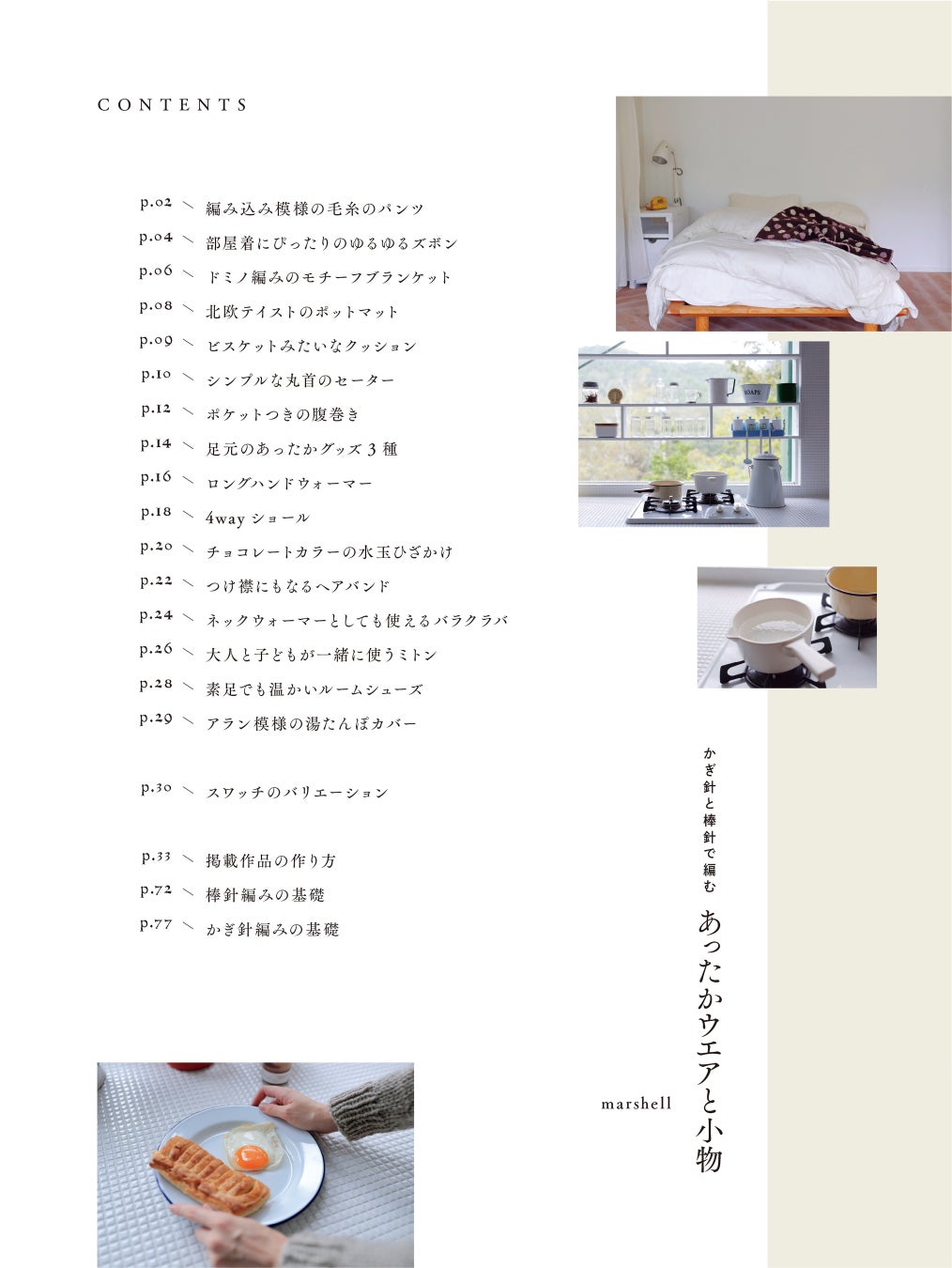 編み込み模様の毛糸のパンツ/部屋着にぴったりのゆるゆるズボン/ドミノ編みのモチーフブランケット/北欧テイストのポットマット/ビスケットみたいなクッション/シンプルな丸首のセーター/ポケットつきの腹巻き/足元のあったかグッズ3種(ゆったり靴下・レッグウォーマー・ぴったり靴下)/ロングハンドウォーマー/4wayショール/チョコレートカラーの水玉ひざかけ/つけ襟にもなるヘアバンド/ネックウォーマーとして使えるバラクラバ/大人と子どもが一緒に使うミトン/素足でも温かいルームシューズ/アラン模様の湯たんぽカバー