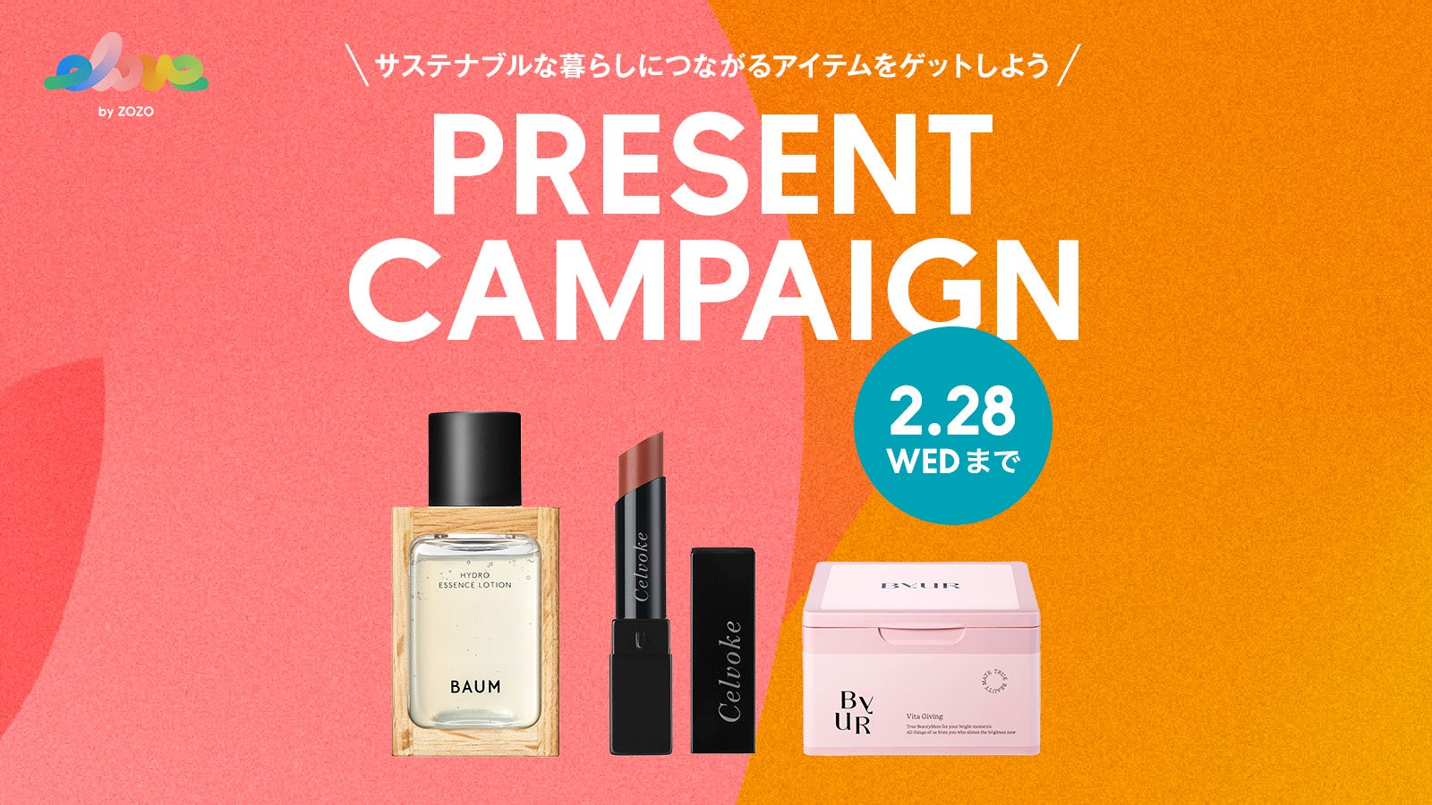 1周年を迎えることができた感謝と、サステナビリティにつながるアクションを実際に体験いただきたいという想いから実施する「elove by ZOZO」 1周年記念プレゼントキャンペーン第2弾では、サステナブルな暮らしにつながるシートマスクや化粧液、リップスティックなどのアイテムをセットにし、抽選で計14名様にプレゼントいたします。